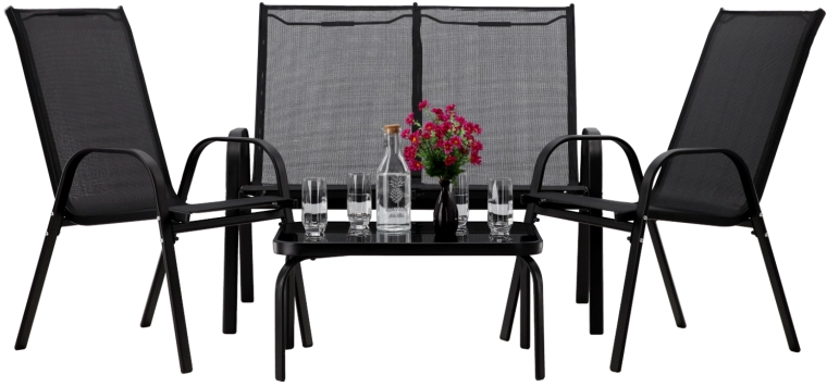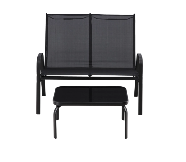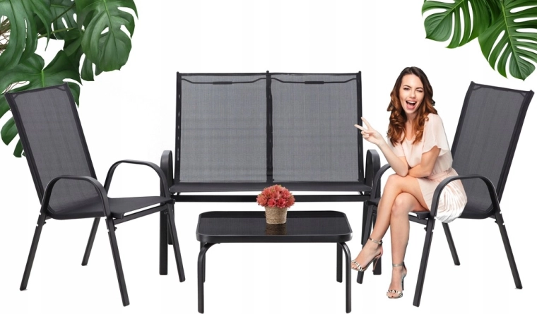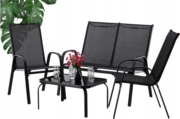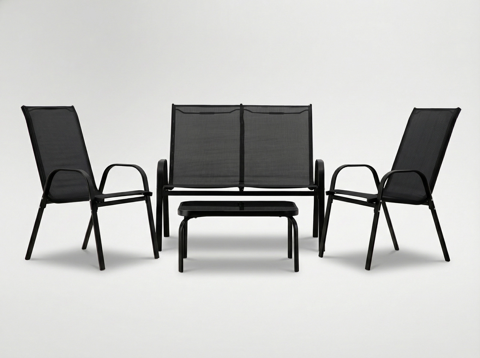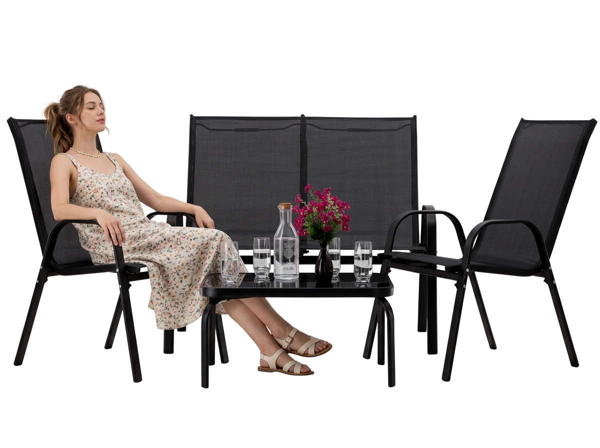Užijte si odpočinek venku se stylovým setem, který zahrnuje dvoumístnou lavici, dvě křesla a nízký stolek se skleněnou deskou. Minimalistický černý vzhled se snadno sladí s jakýmkoli exteriérem, zatímco prodyšná síťovina Textilene poskytuje vzdušné pohodlí i během horkých dnů.