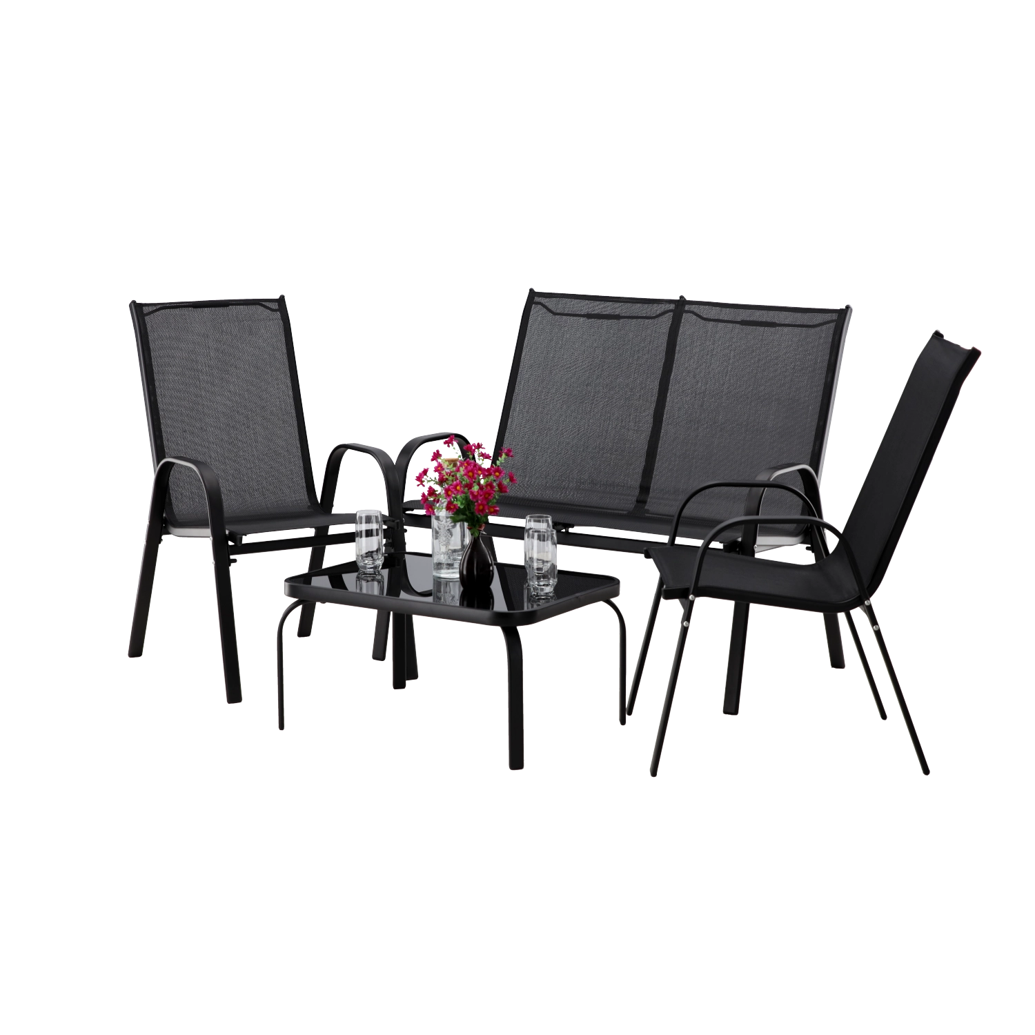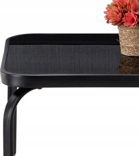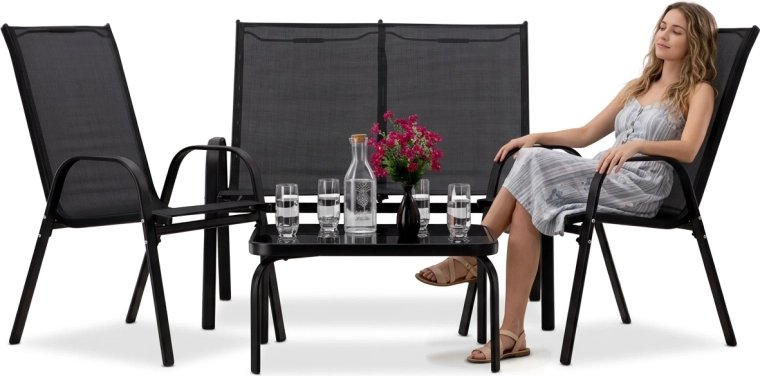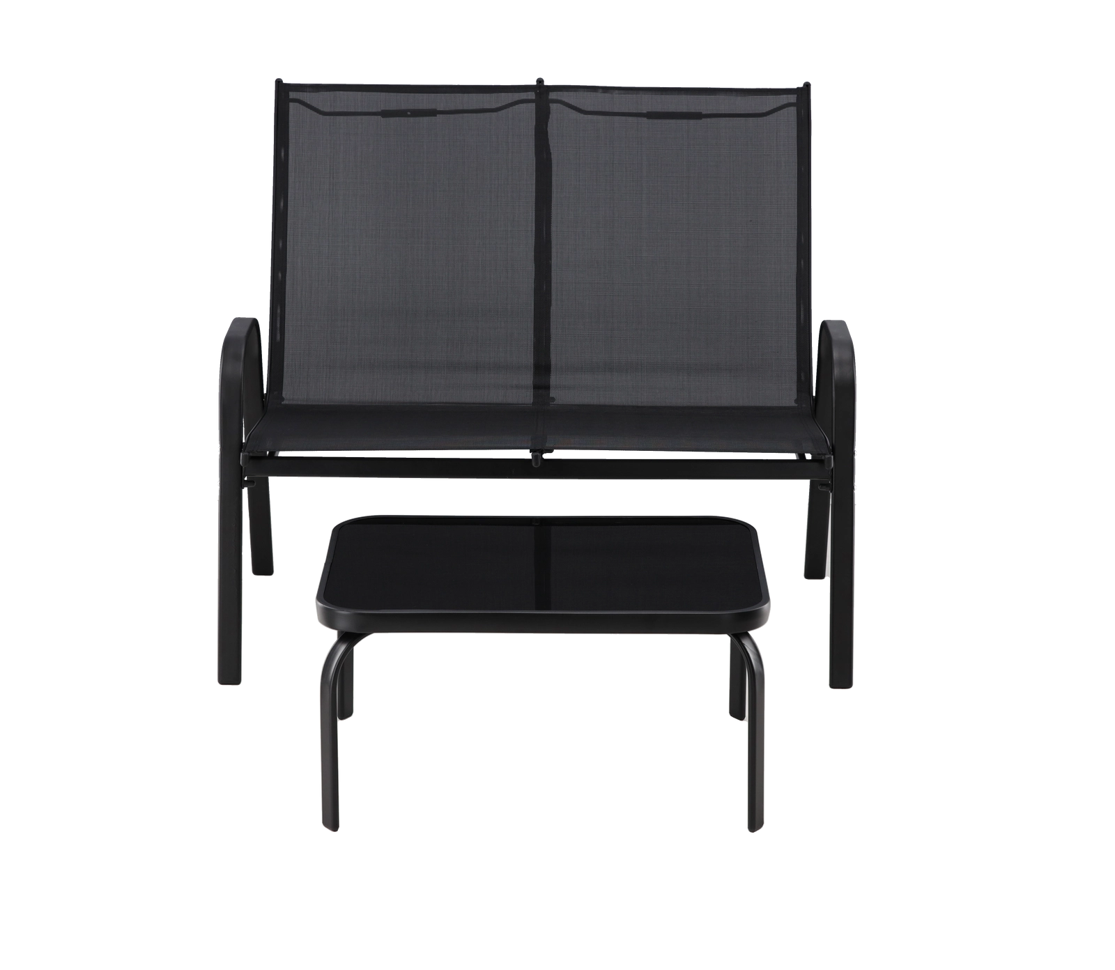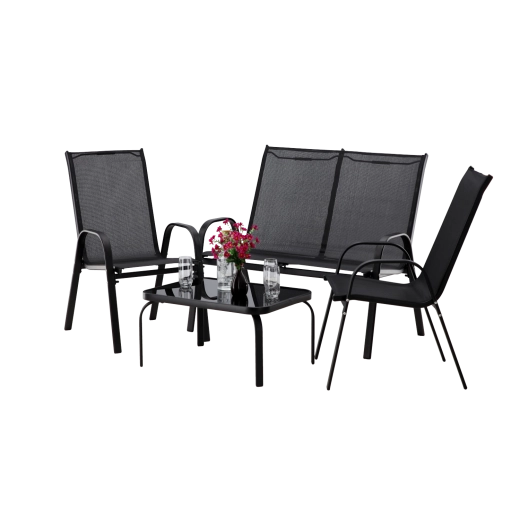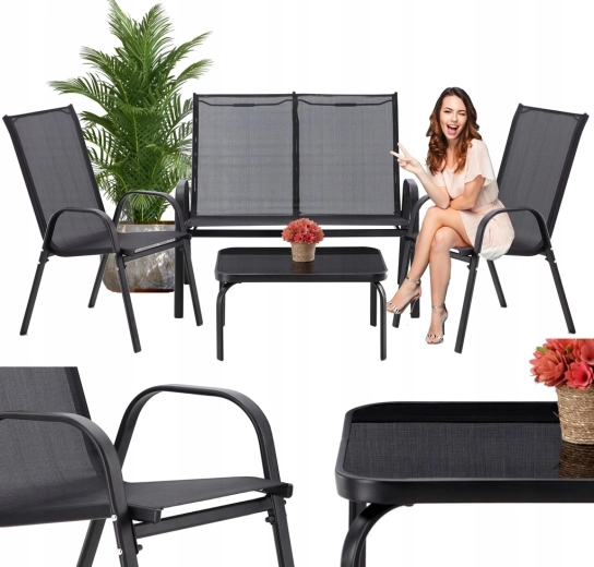 Užijte si odpočinek venku se stylovým setem, který zahrnuje dvoumístnou lavici, dvě křesla a nízký stolek se skleněnou deskou. Minimalistický černý vzhled se snadno sladí s jakýmkoli exteriérem, zatímco prodyšná síťovina Textilene poskytuje vzdušné pohodlí i během horkých dnů.