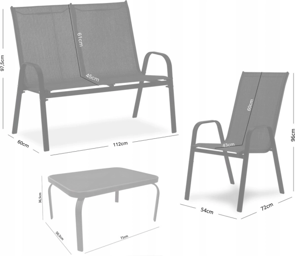 Elegantní zahradní set pro čtyři osoby kombinuje moderní design, odolné materiály a pohodlné sezení. Kovová konstrukce s práškovým lakováním zajišťuje stabilitu, prodyšná textilie Textilene 2x1 je komfortní a snadno se udržuje. Konferenční stolek má tvrzené sklo 5 mm pro bezpečné servírování nápojů i občerstvení – ideální na balkon, terasu i do zahrady.