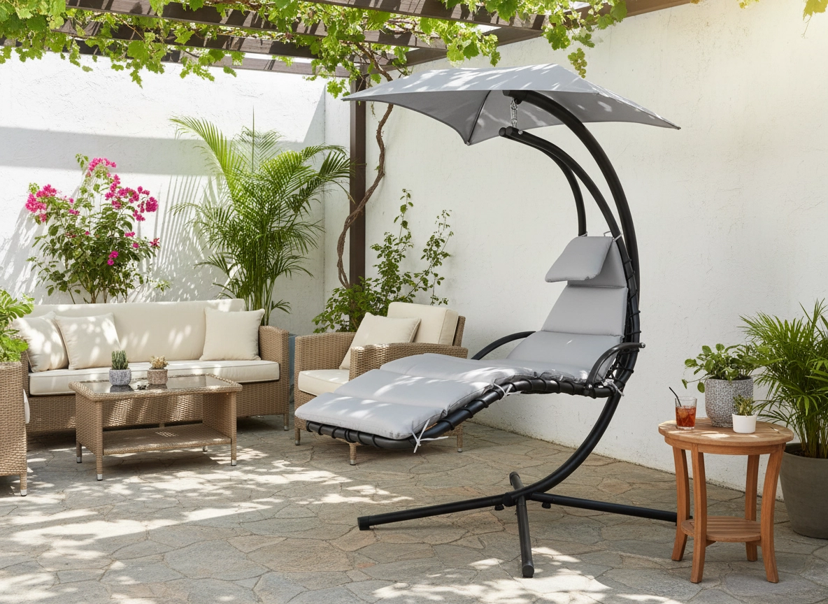 Díky funkčnímu baldachýnu získáte příjemný stín a ochranu před sluncem. Elegantní, neutrální šedý odstín se snadno sladí s jakýmkoli exteriérem a vytváří harmonické místo pro relax.