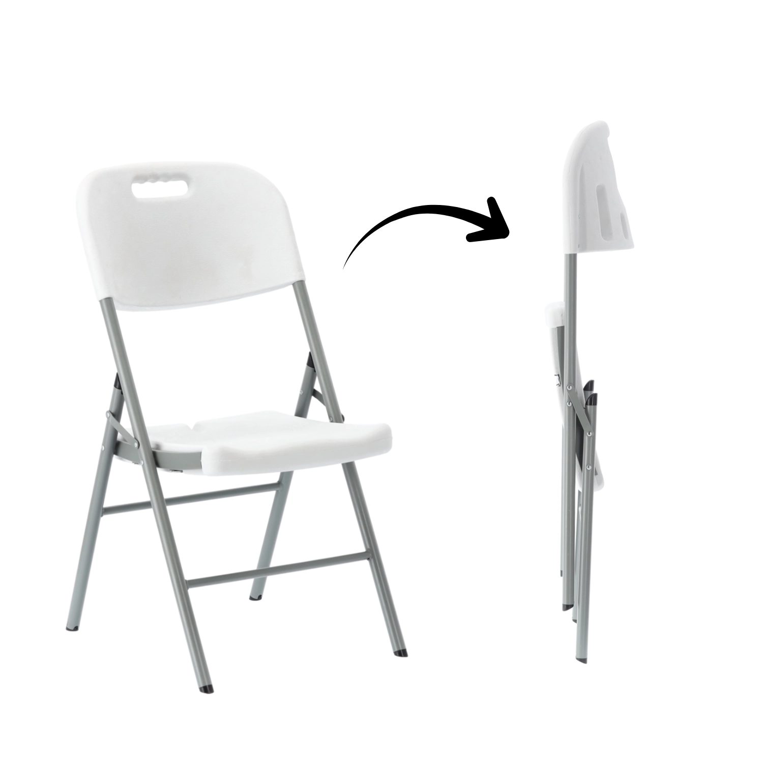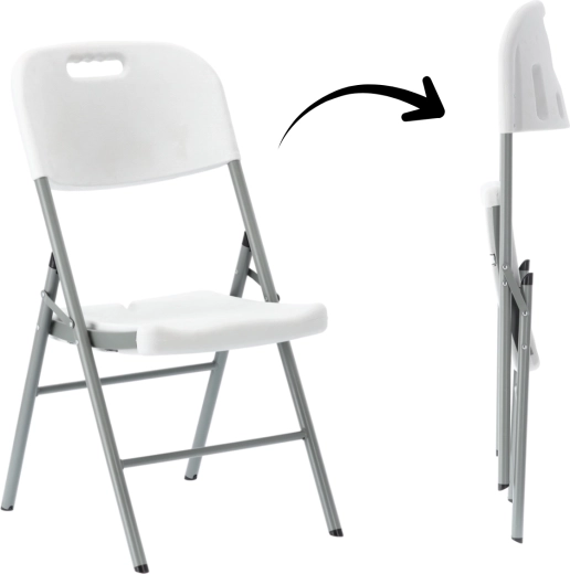 Tato univerzální bílá skládací židle kombinuje odolnost, pohodlí a snadnou přenositelnost. Ocelová trubková konstrukce s křížovým vyztužením zajišťuje stabilitu, zatímco sedák a opěrák z HDPE se rychle čistí a odolávají povětrnostním vlivům. Integrovaný úchyt v opěradle usnadňuje přenášení.