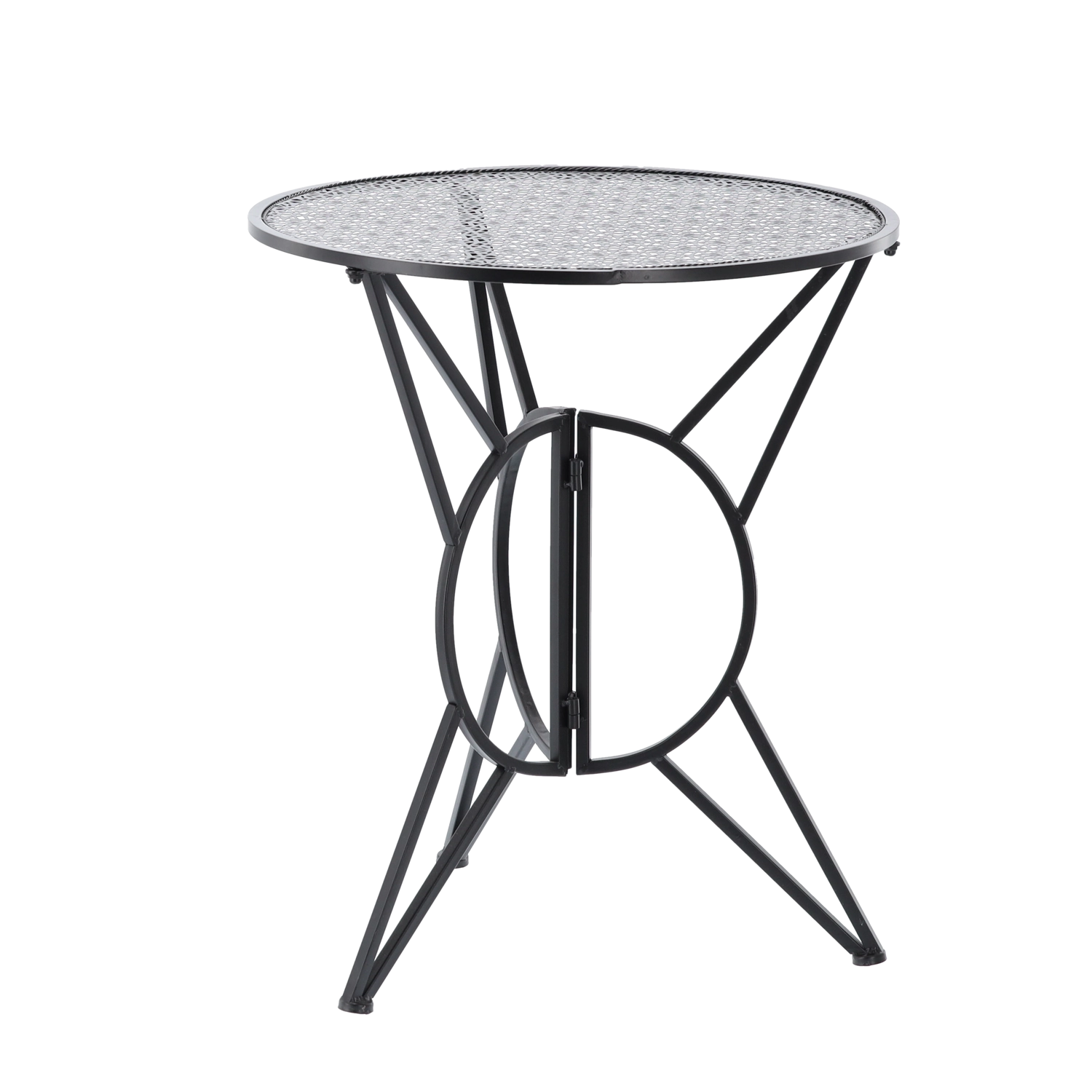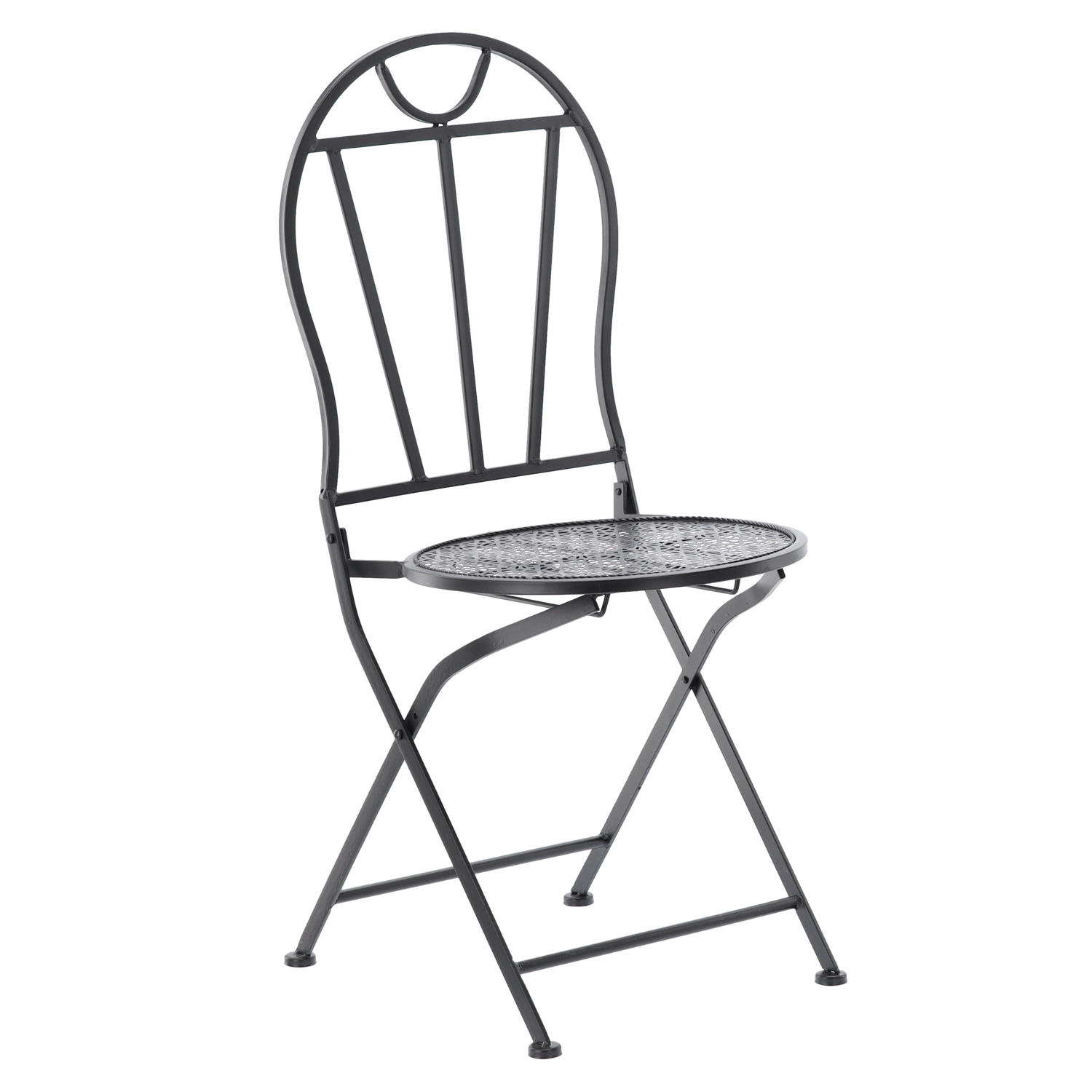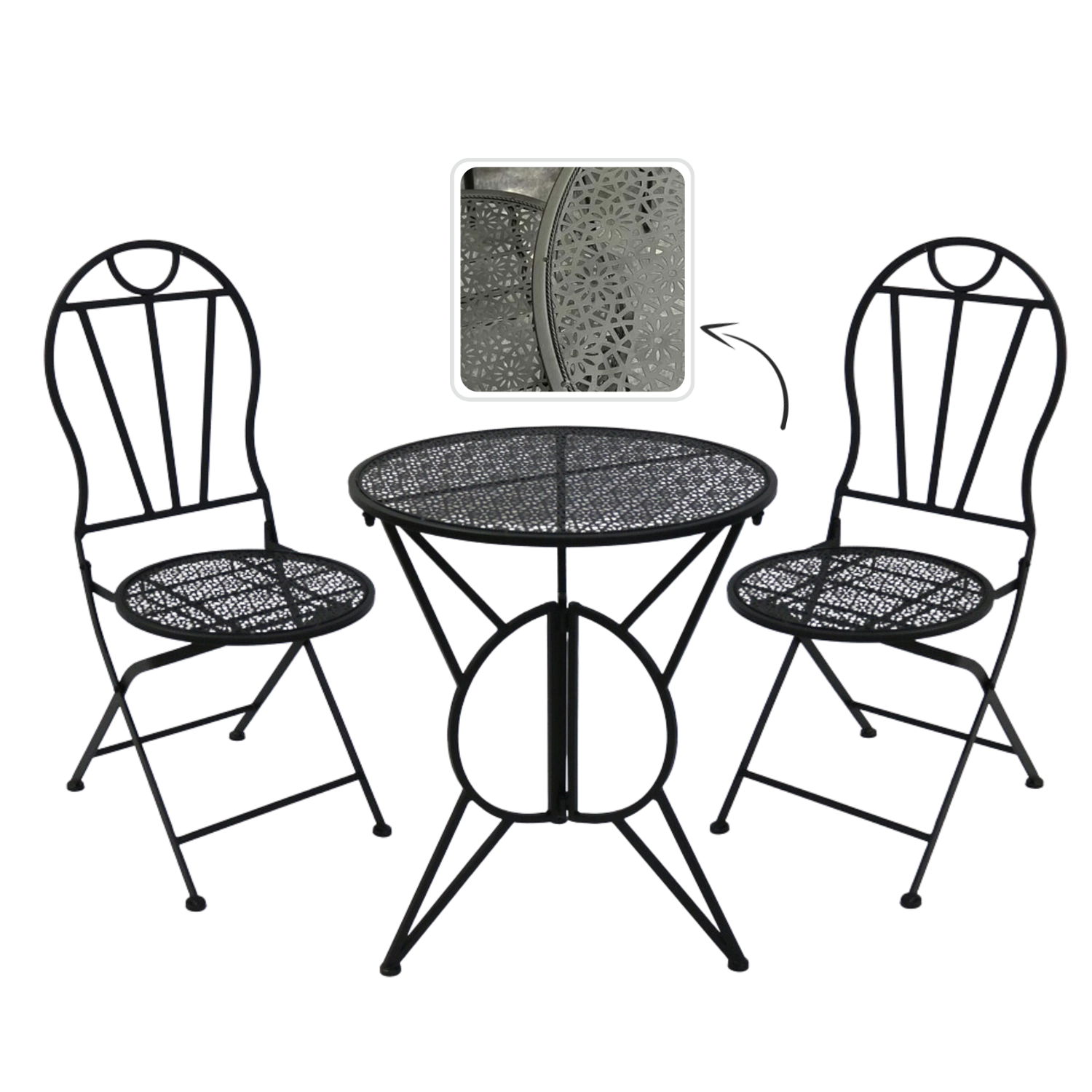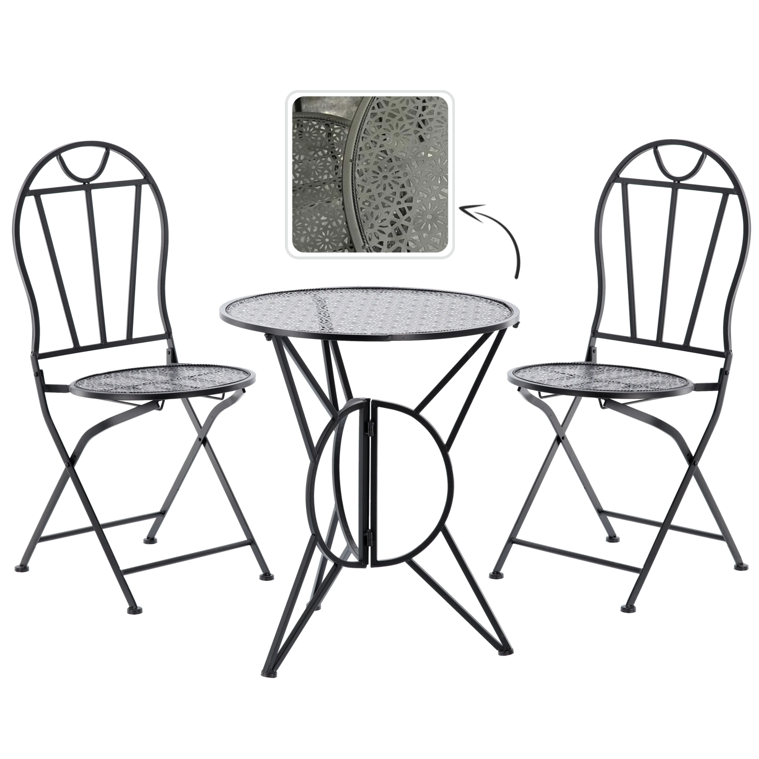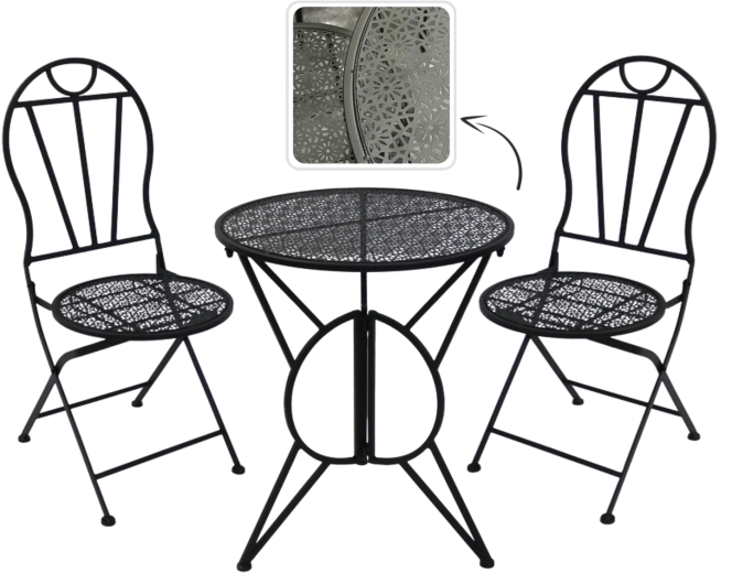 Elegantní kovová bistro sada v retro stylu pro balkon, terasu i zahradu nabízí pevnou a stabilní konstrukci, skládací židle pro snadné uskladnění a stylové perforované vzory na desce stolu i sedácích. Odolné kovové provedení s matným černým povrchem se skvěle hodí pro venkovní použití a zaručí pohodlné posezení u kávy i letních večeří.