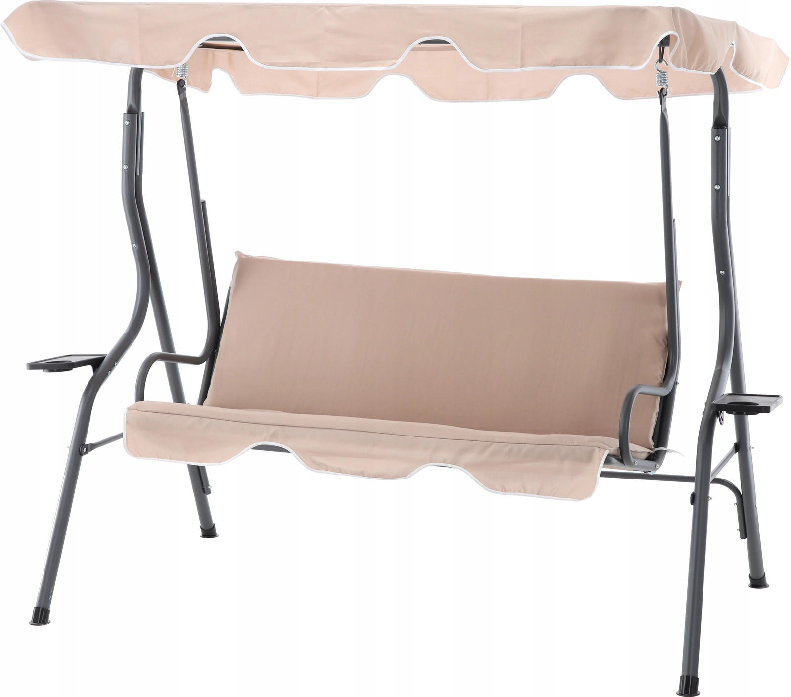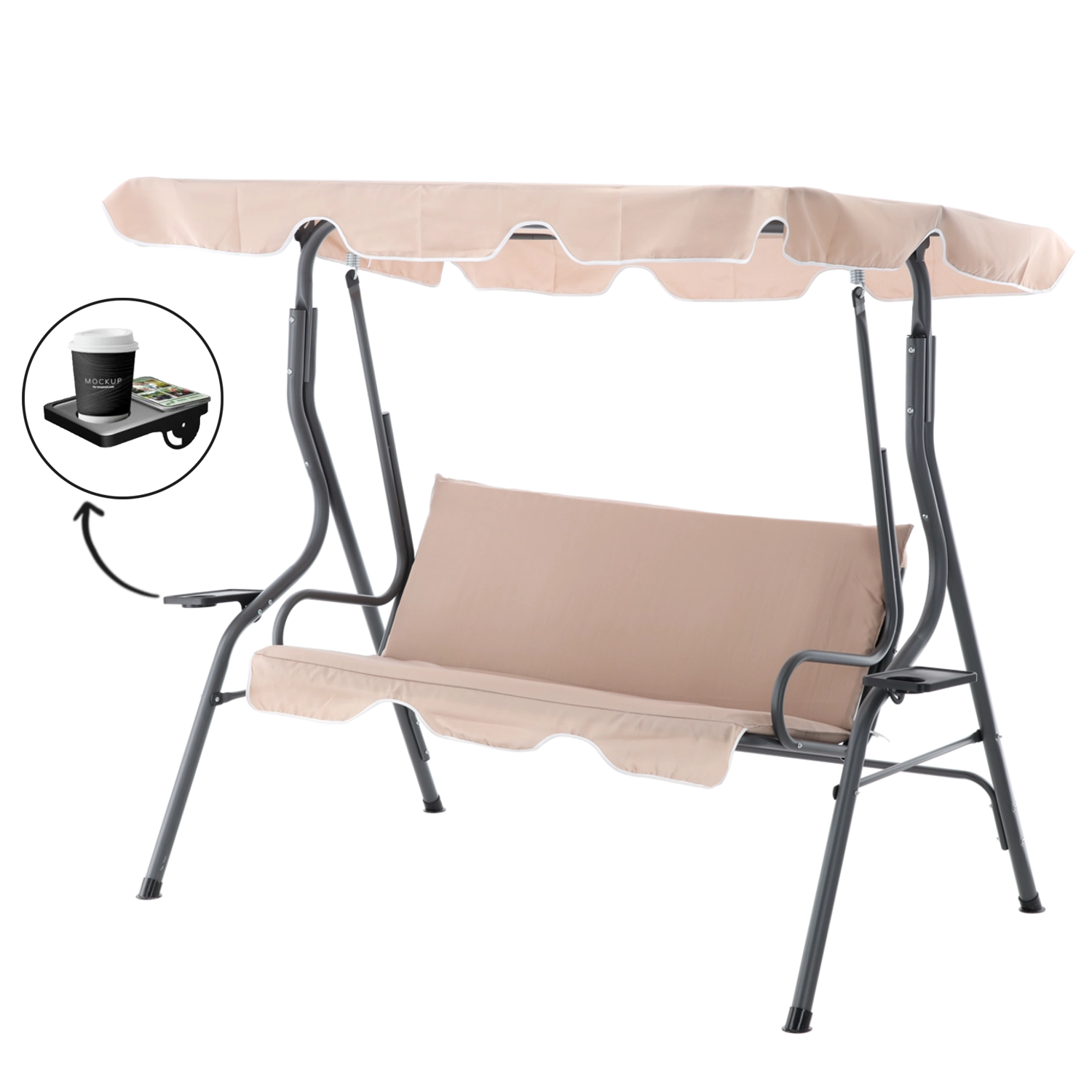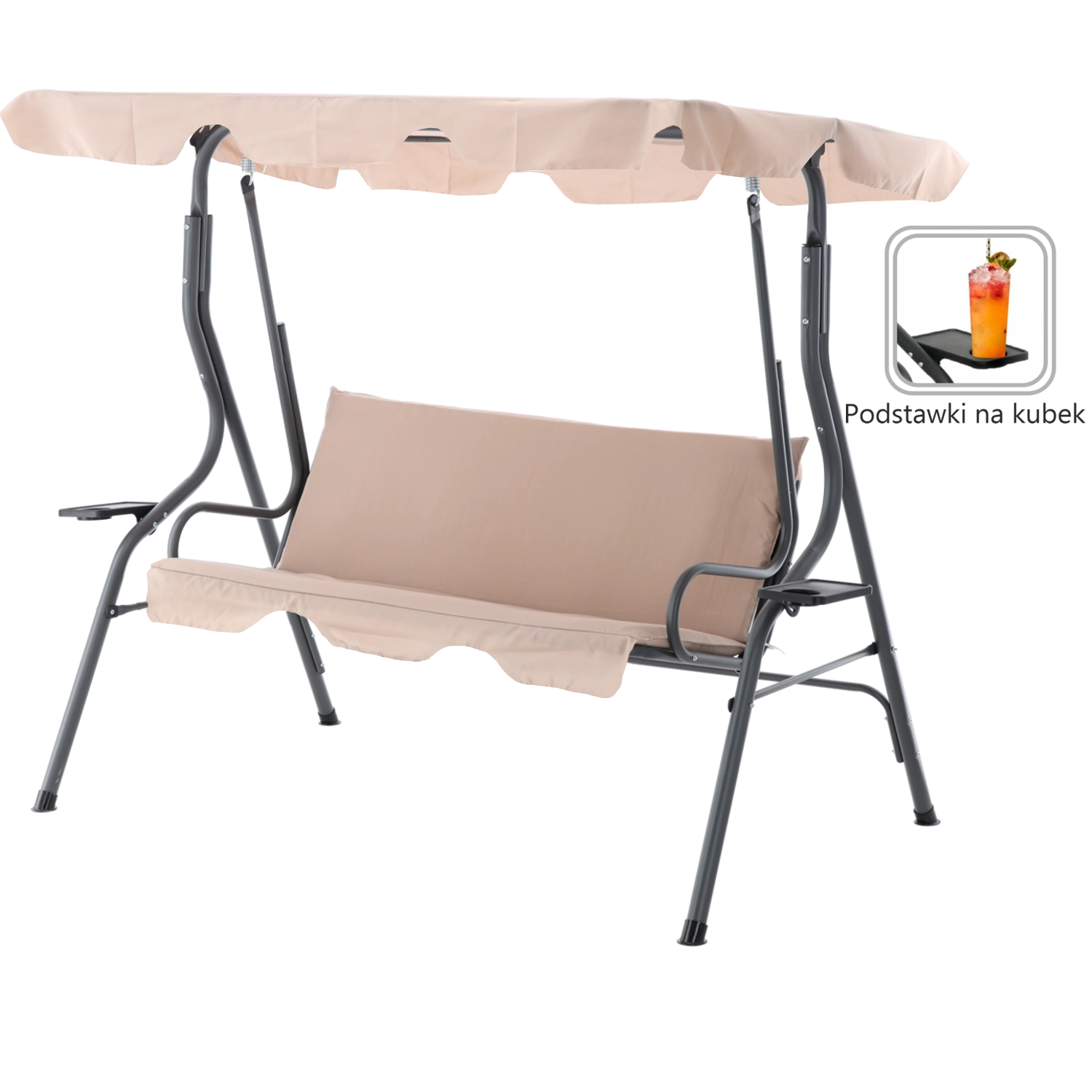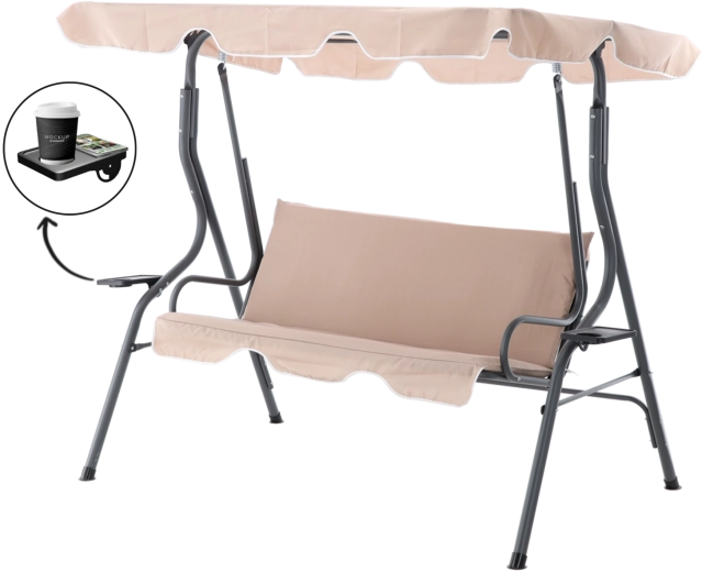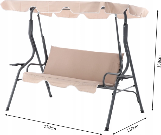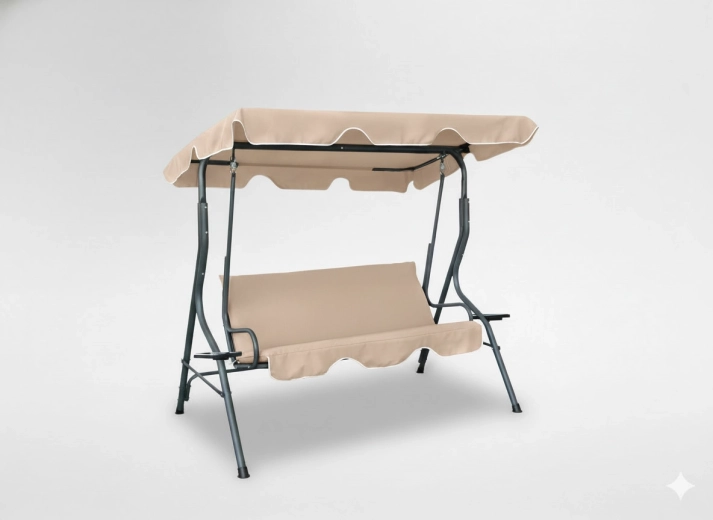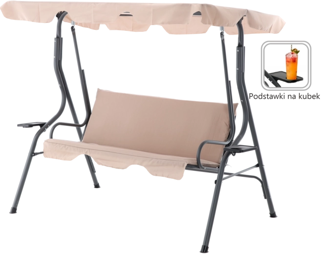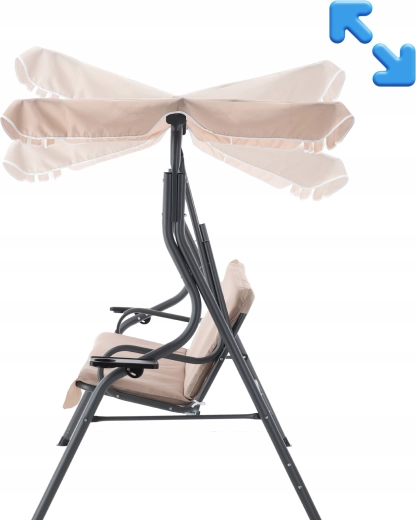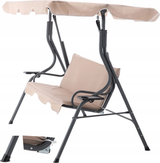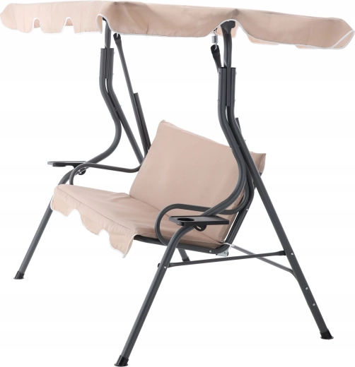 Elegantní zahradní houpačka v tmavě béžové barvě přinese do vaší zahrady, na terasu i balkon pohodlí a styl. Díky nastavitelnému slunečnímu přístřešku, pevné ocelové konstrukci a dvěma držákům na nápoje si užijete klidný relax ve stínu a bezpečí. Ideální pro 2–3 osoby, s nosností 220 kg a odolnými materiály pro venkovní použití.