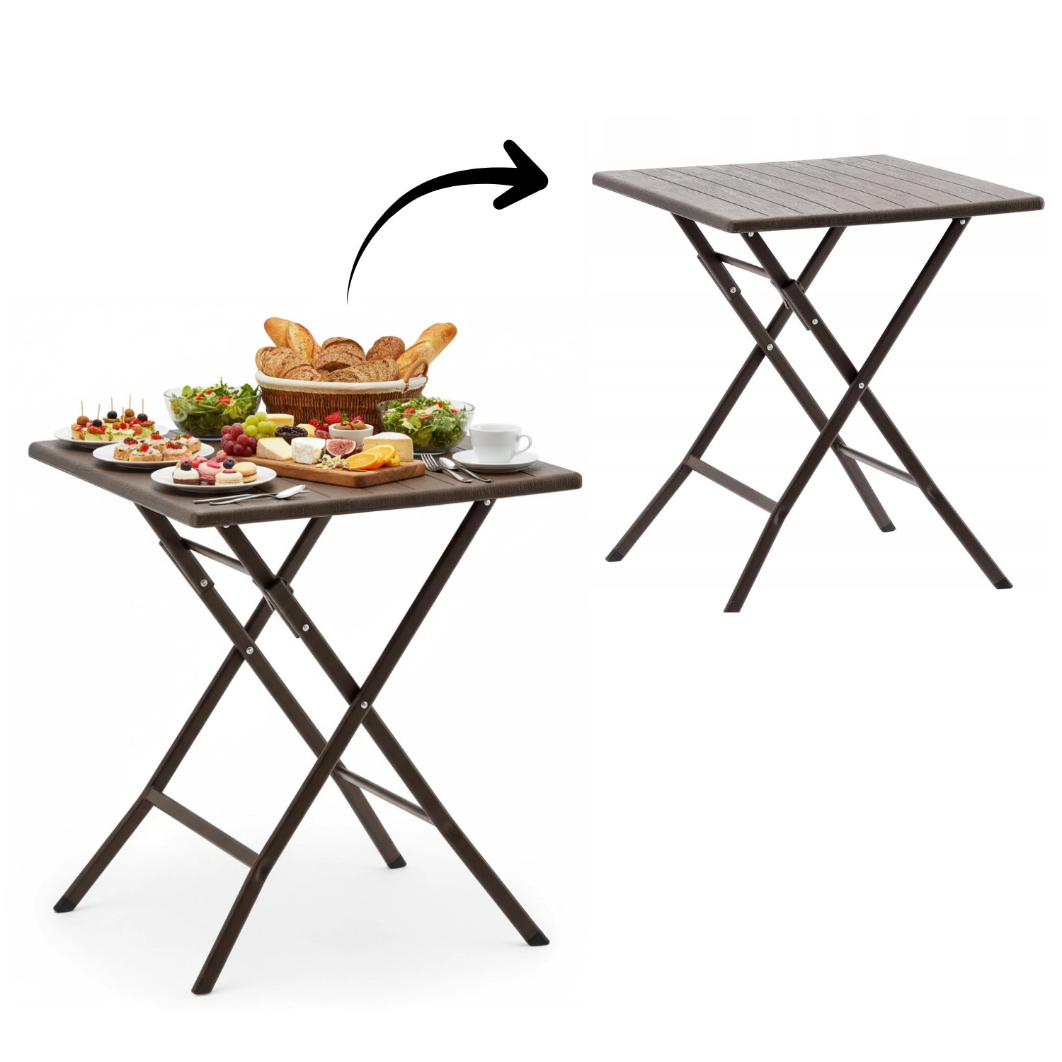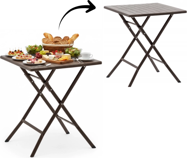 Praktický skládací turistický stůl s rozměry 61,5 × 61,5 × 73 cm kombinuje lehkou konstrukci s vysokou stabilitou. Povrch v hnědém odstínu s dekorem dřeva snadno sladíte s venkovním nábytkem a díky skládacím nohám ho během chvilky uložíte i do malých prostor.