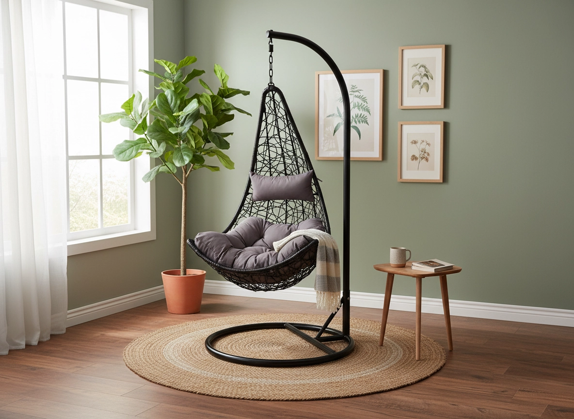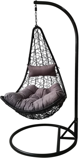 Stylové závěsné křeslo v elegantní černé barvě se šedým polstrem přinese do vašeho domova i zahrady relax a design. Díky odolné ocelové konstrukci a technoratanu odolnému vůči UV záření nabízí vysoký komfort, stabilitu a dlouhou životnost.