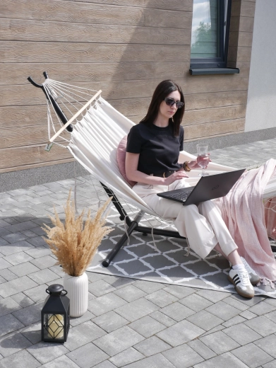 Odolná tkanina z bavlněno‑polyesterové směsi je prodyšná, přitom pevná a příjemná k pokožce. Díky maximální nosnosti 120 kg je síť spolehlivá pro každodenní relax na zahradě, terase i v interiéru.