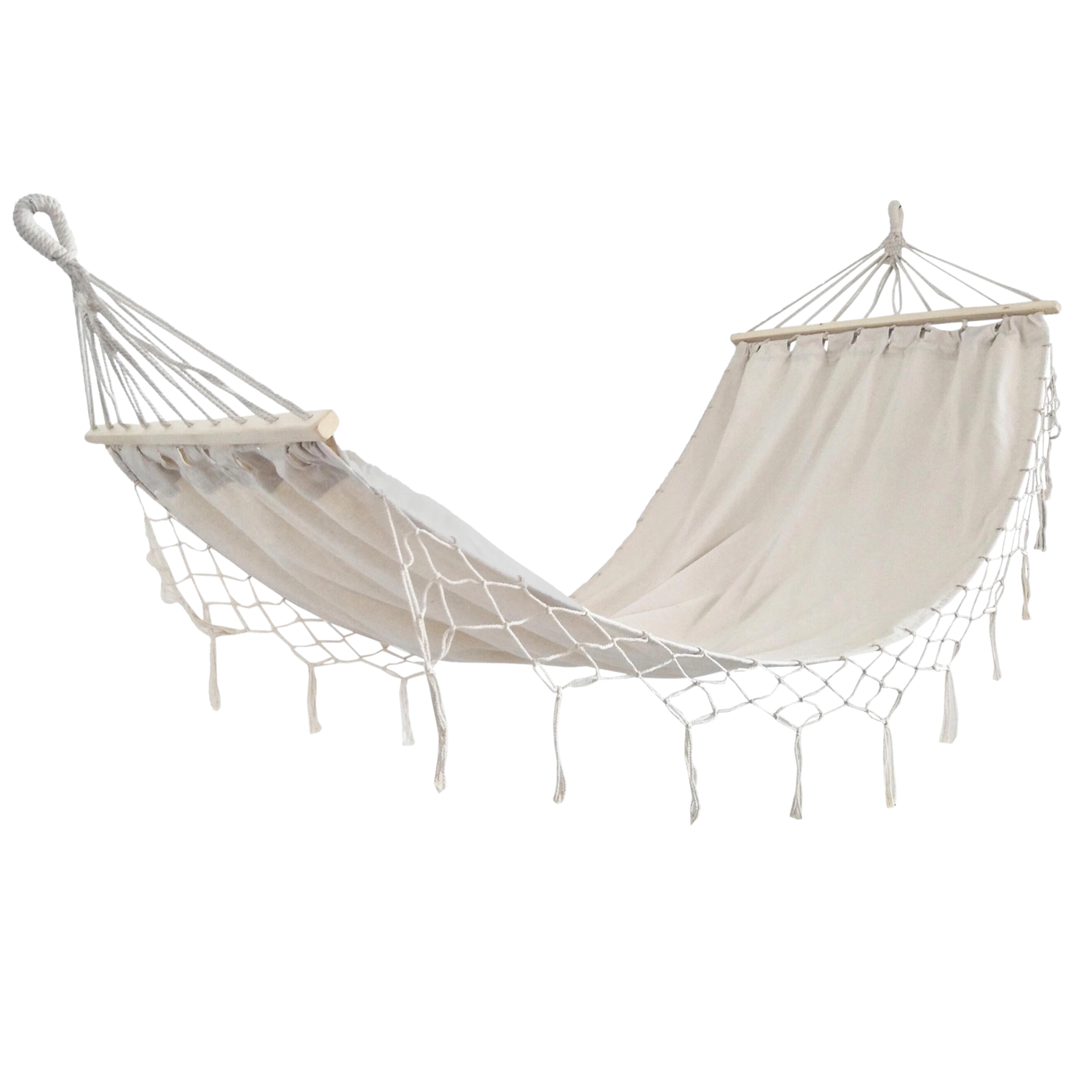 Tato béžová houpací síť s třásněmi je dokonalým spojením designu a funkčnosti. Přirozený odstín snadno sladíte s venkovním nábytkem i interiérem, zatímco dřevěné rozpěrné tyče udržují pohodlně otevřenou lehací plochu pro čtení, odpočinek i krátké zdřímnutí.