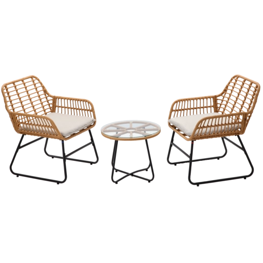 Vytvořte si útulný koutek k odpočinku. Set kombinuje moderní otevřené ratanové pletení s pevnou kovovou podnoží a transparentní skleněnou deskou stolku. Díky kompaktním rozměrům se skvěle hodí na balkón, terasu i menší zahradní zákoutí.