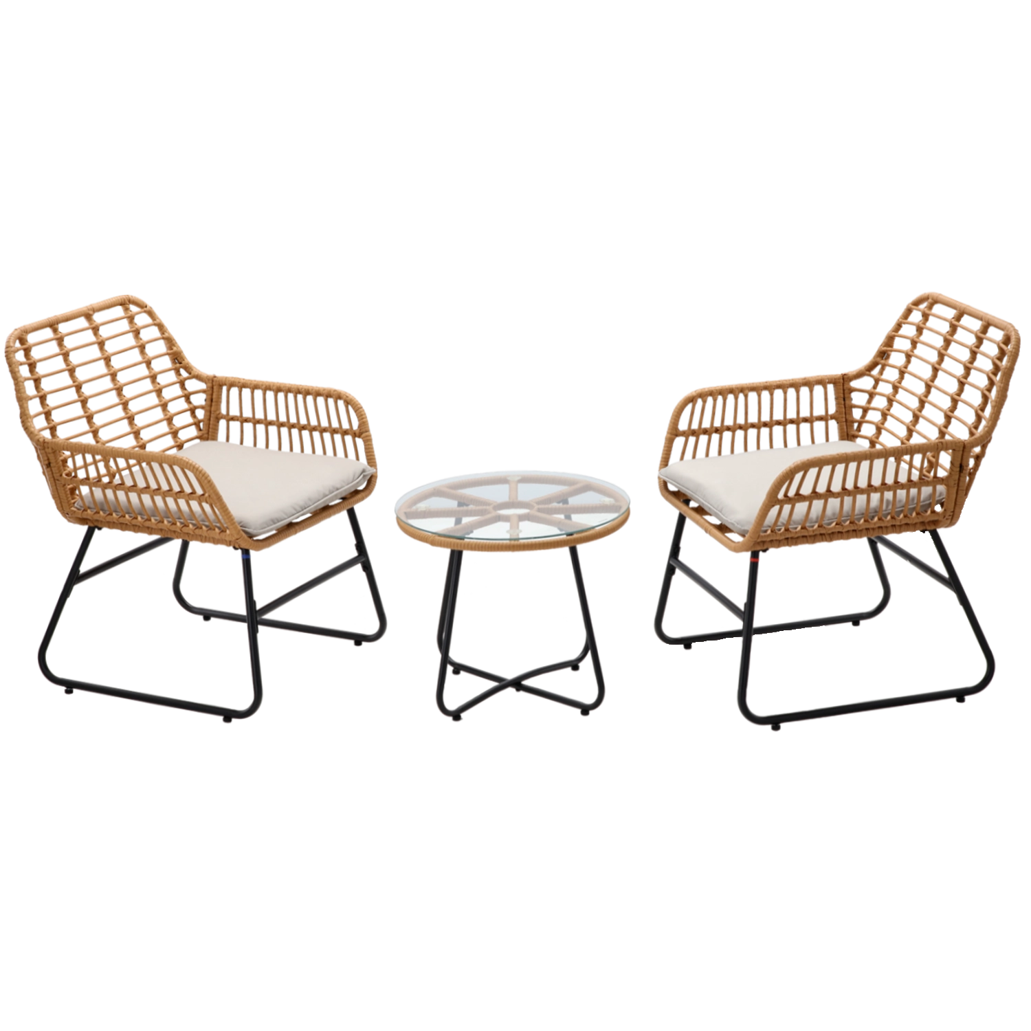 - Moderní vzhled: vzdušná ratanová skořepina křesel a elegantní kulatý stolek.