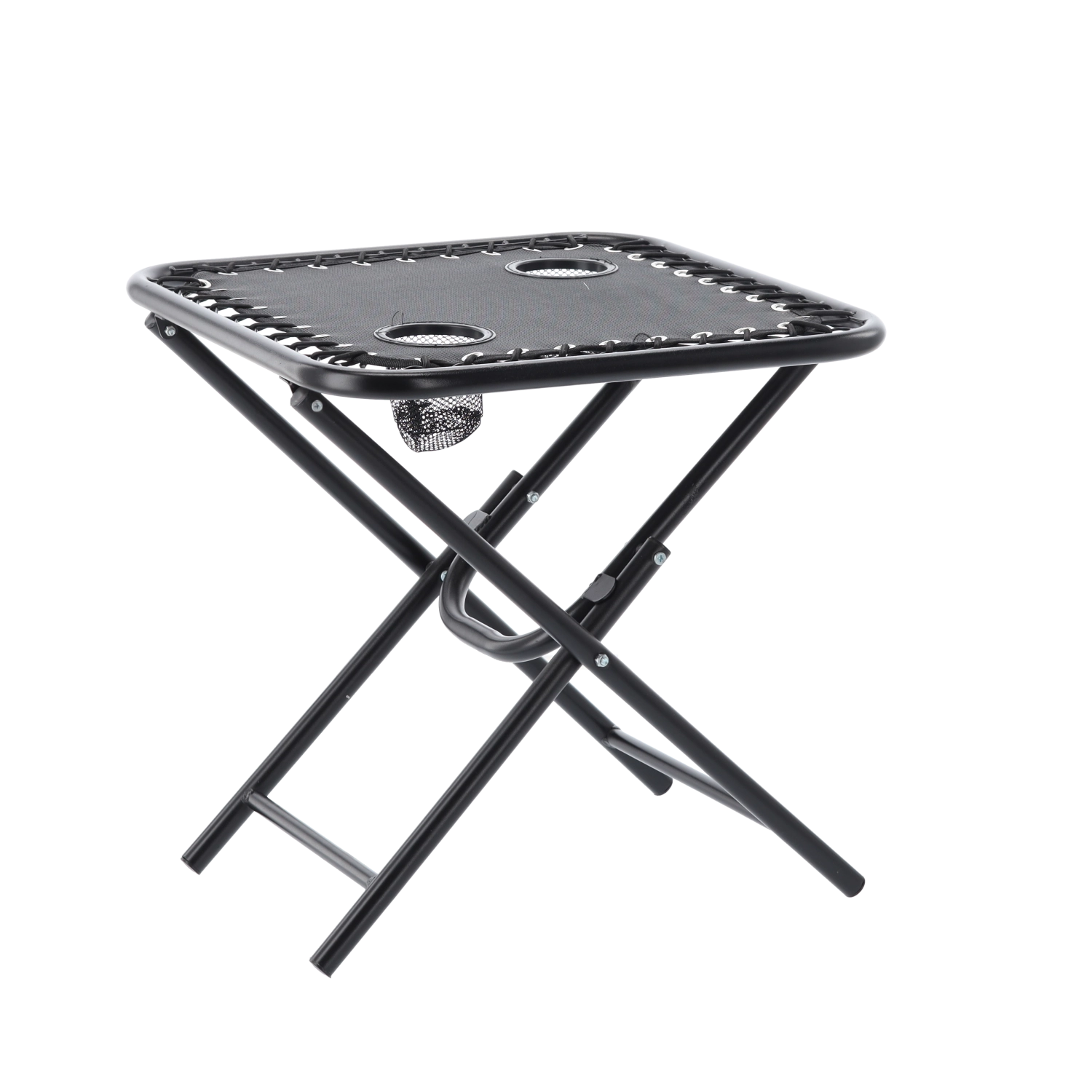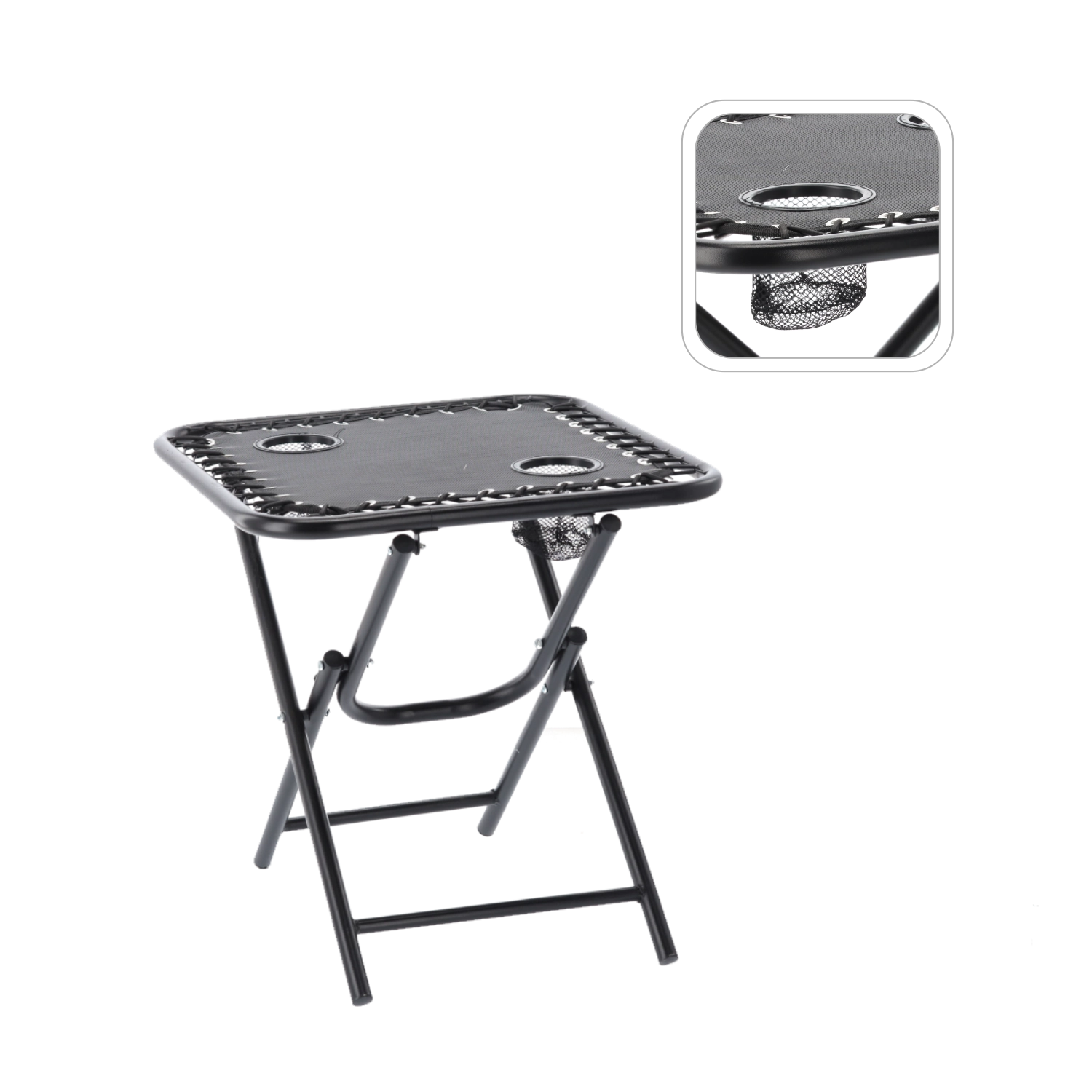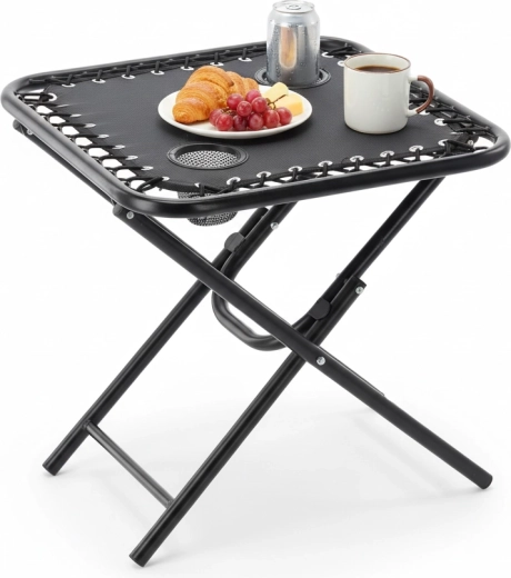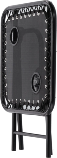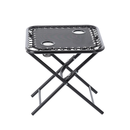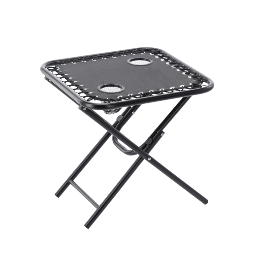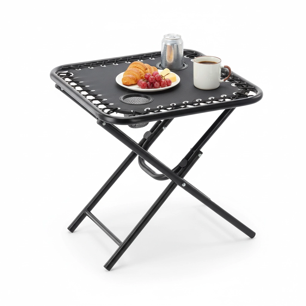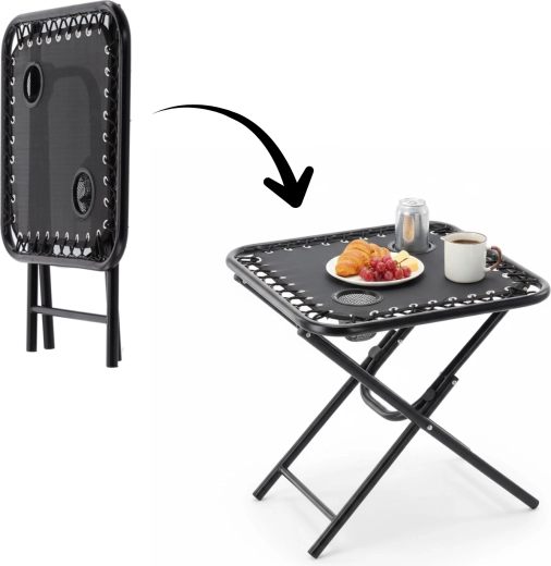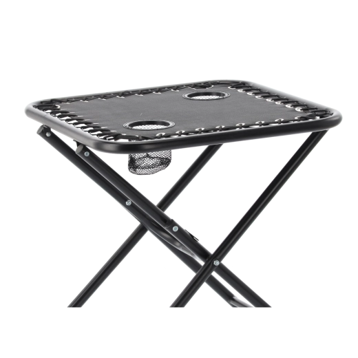 Hledáte praktický stolek na cesty, který rozložíte během pár sekund? Tento černý skládací turistický stolek kombinuje stabilitu kovového rámu s lehkým a přenosným provedením. Dva zabudované držáky bezpečně udrží kelímky či plechovky, takže máte nápoje vždy po ruce.