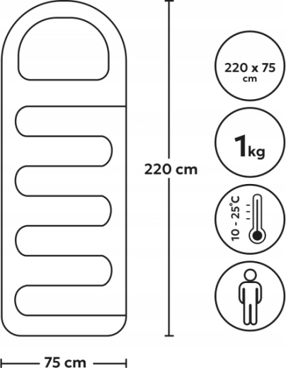 Díky hmotnosti okolo 1 kg a dodávanému kompresnímu obalu je ideální na kempování, festivaly, přespání na chatě i cestování. Odolný zip usnadňuje větrání a manipulaci, zatímco prostorný střih 220 × 75 cm nabízí pohodlí i vyšším uživatelům.
