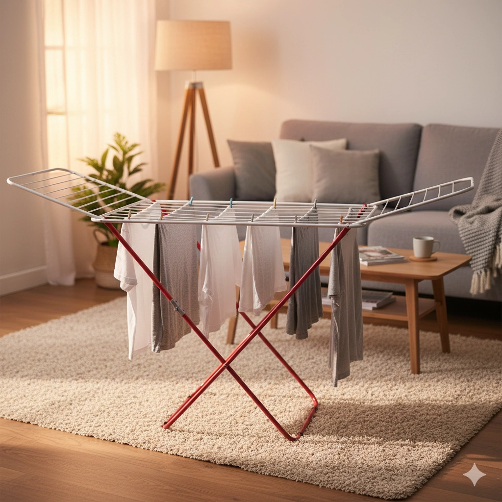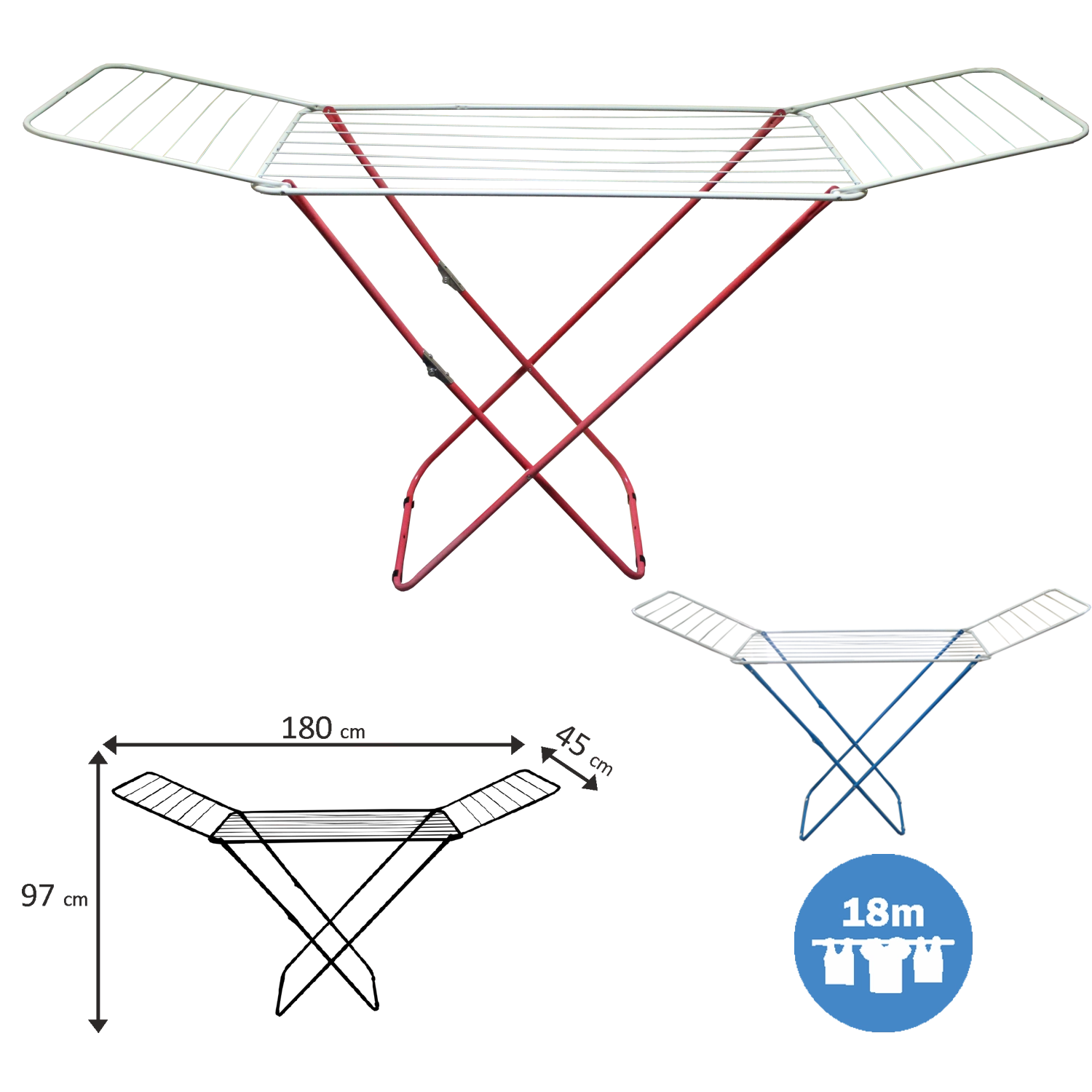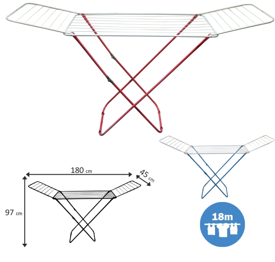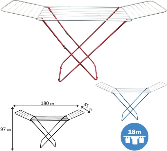 Rozkládací křídla rozšíří plochu pro zavěšení a 18 metrů sušící délky pohodlně postačí pro týdenní dávku prádla. Stabilní X-konstrukce a pevné dráty udrží ručníky, povlečení i jemné kousky.