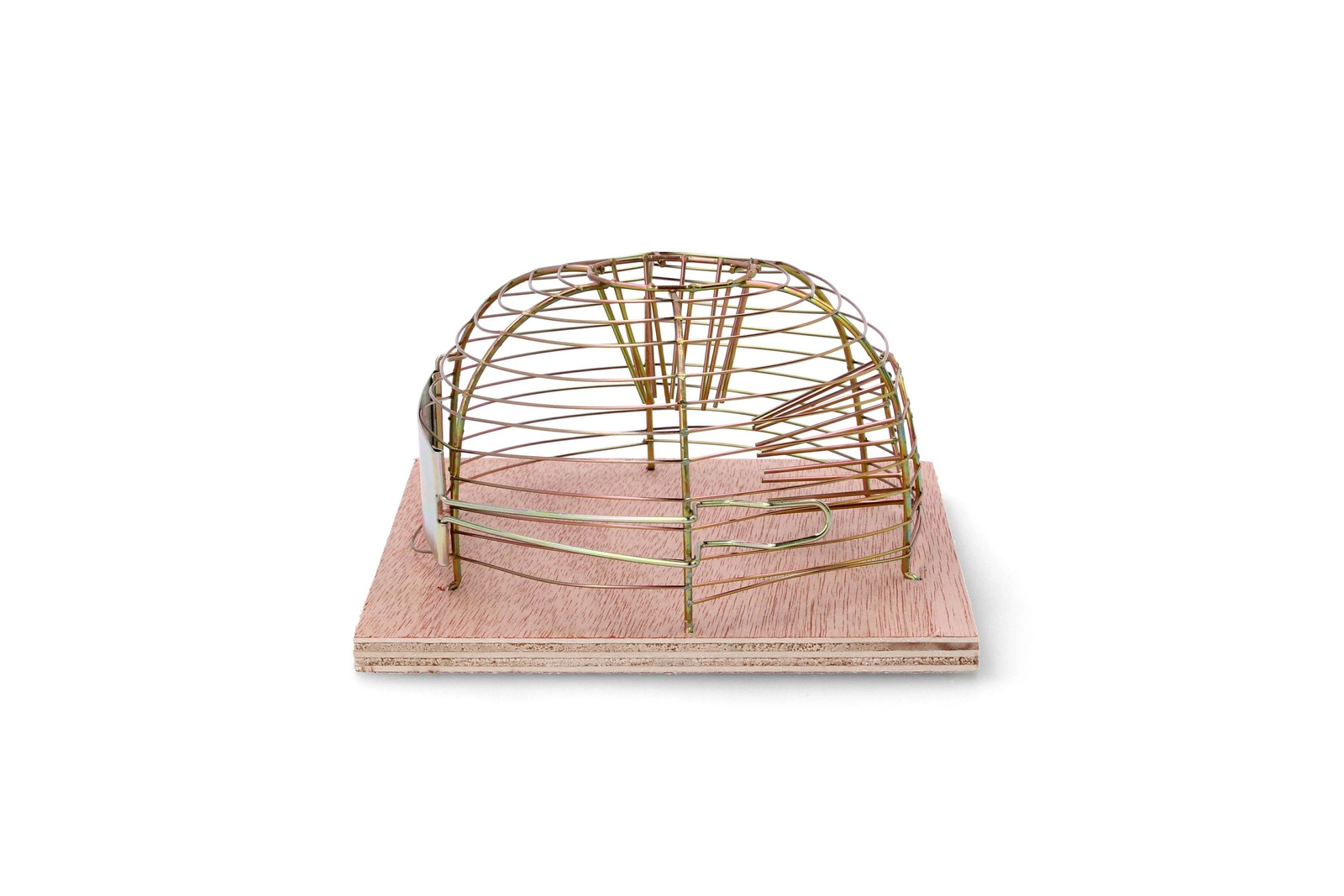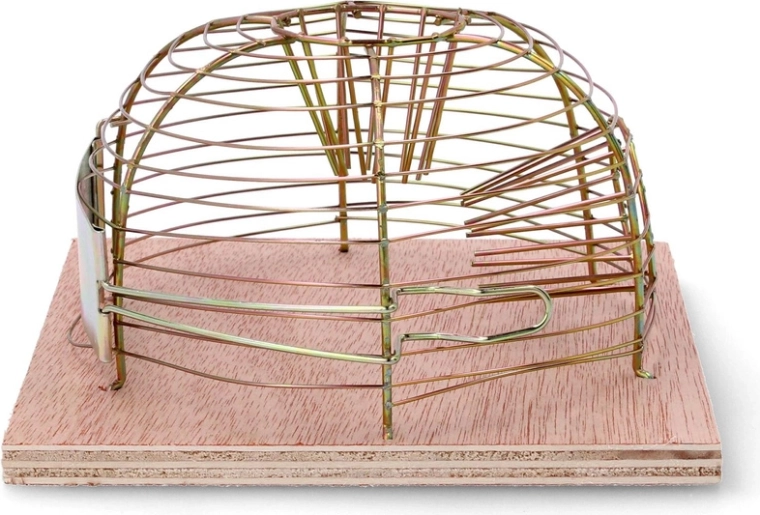 Zlatě tónovaná kovová klec poskytuje odolnost a výbornou ventilaci, zatímco dřevěná základna drží past stabilně na místě.