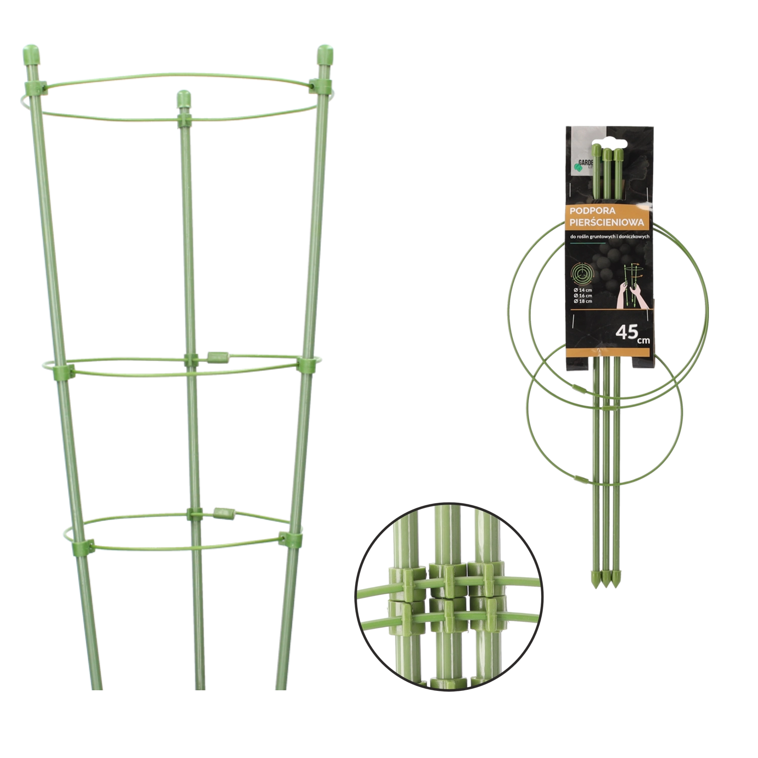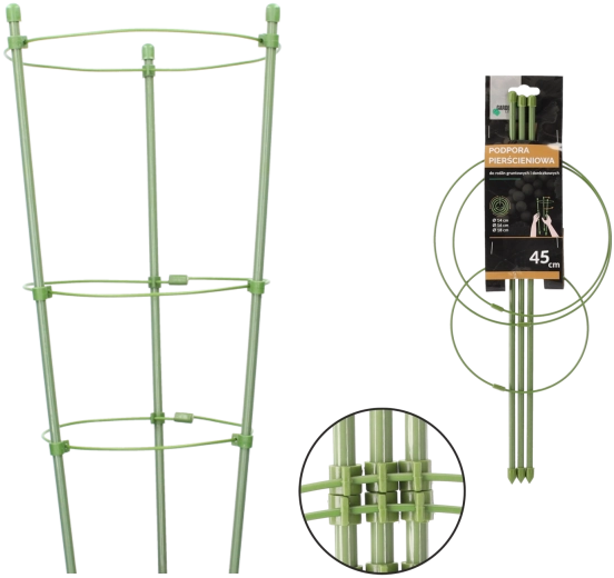 Praktická kruhová opora pro květiny a keře z odolné kovové konstrukce s polyetylenovým povrchem. Díky zelené barvě splyne s porostem, poskytne stabilní oporu a zabrání poléhání rostlin i při větru. Ideální pro borůvky, hortenzie a rostliny v květináčích.