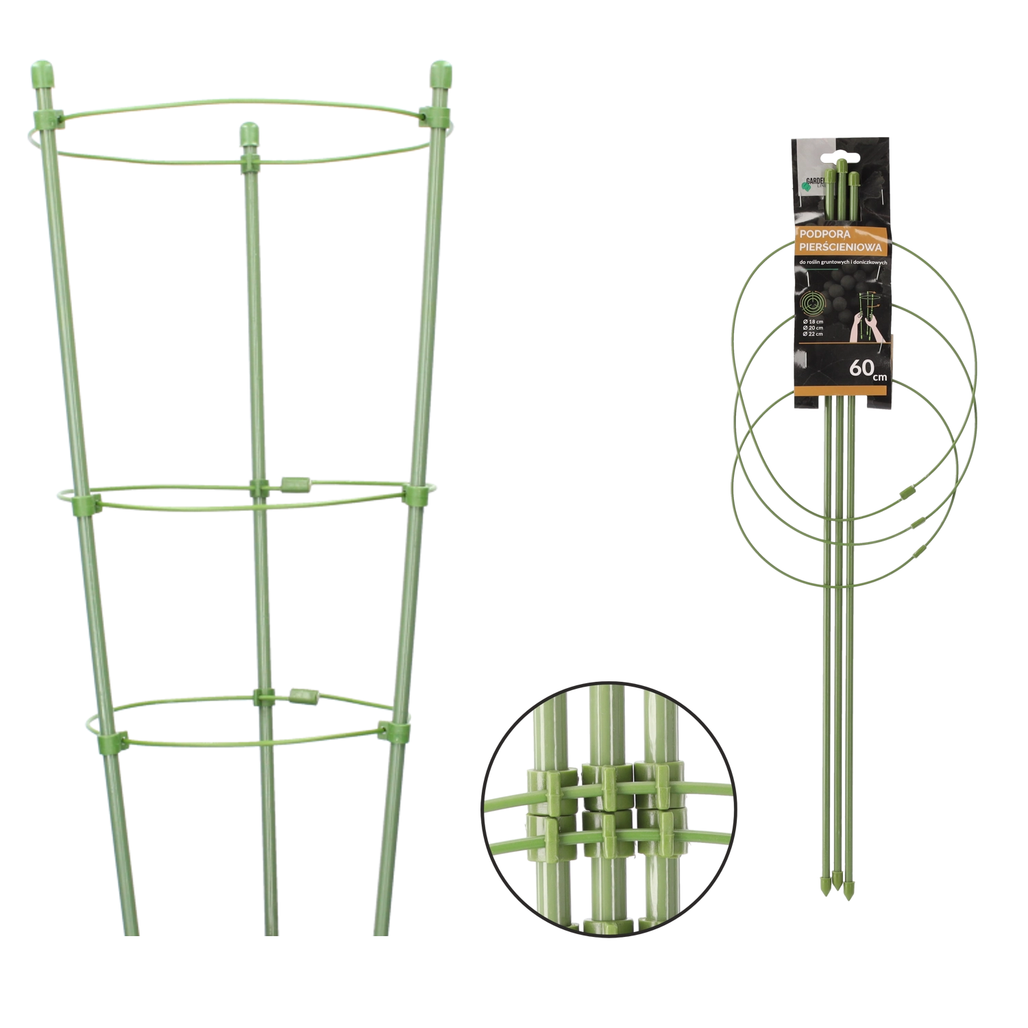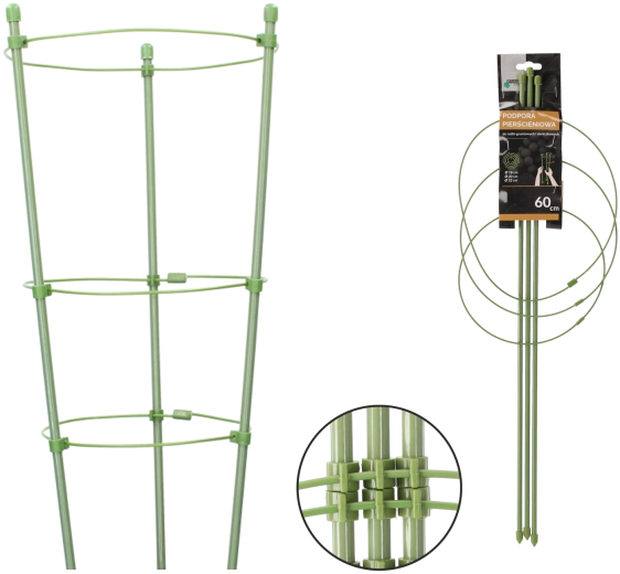 Tato kruhová opora je ideální pro pěstování na záhonech i v květináčích. Konstrukce z oceli s polyetylenovým povlakem je vysoce odolná proti povětrnosti a mechanickému poškození, zatímco zelené provedení je v porostu téměř neviditelné. Zabrání pokládání rostlin k zemi a podpoří jejich harmonický a vzpřímený růst.