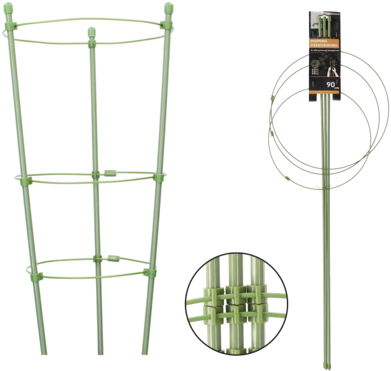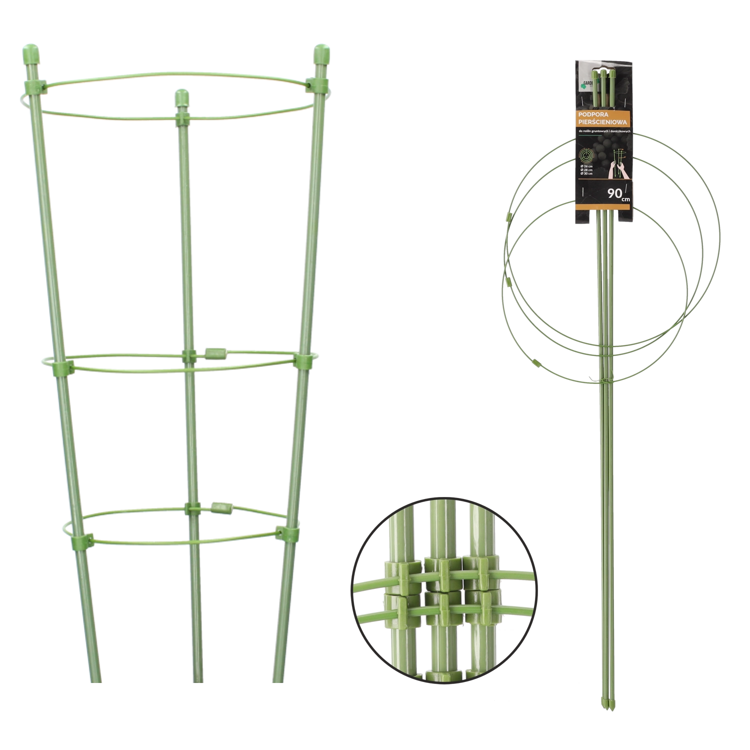 Tato kruhová opora se třemi prstenci zabraňuje polehávání stonků a podporuje rovnoměrný, harmonický růst. Robustní kovová konstrukce s povrchovou úpravou z polyetylenu je vysoce odolná vůči povětrnosti a mechanickému opotřebení, takže je vhodná pro celoroční použití na zahradě i v interiéru.
