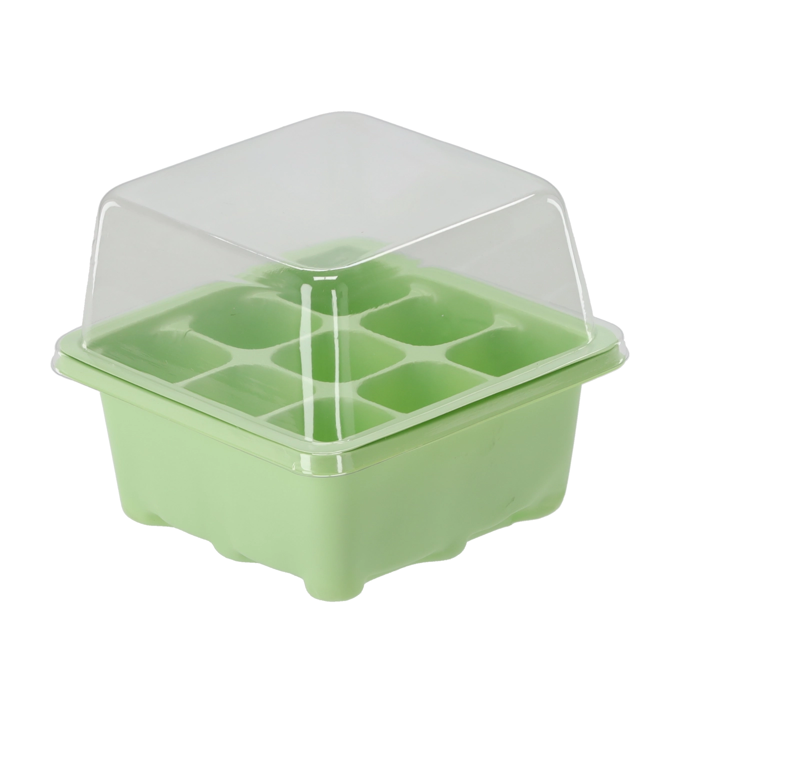 Dělený sadbovač s 9 čtvercovými buňkami (cca 3,5 × 3,5 cm) usnadňuje klíčení, péči i následné přesazení sazenic.