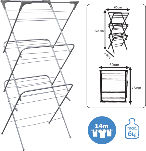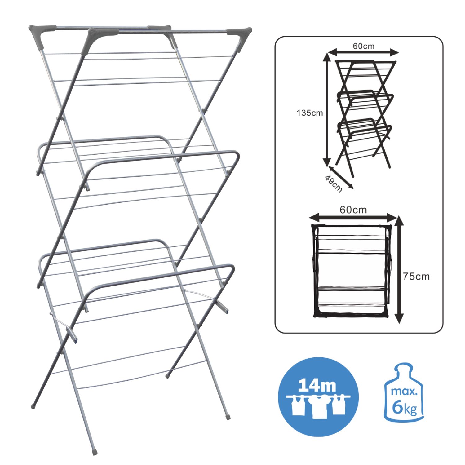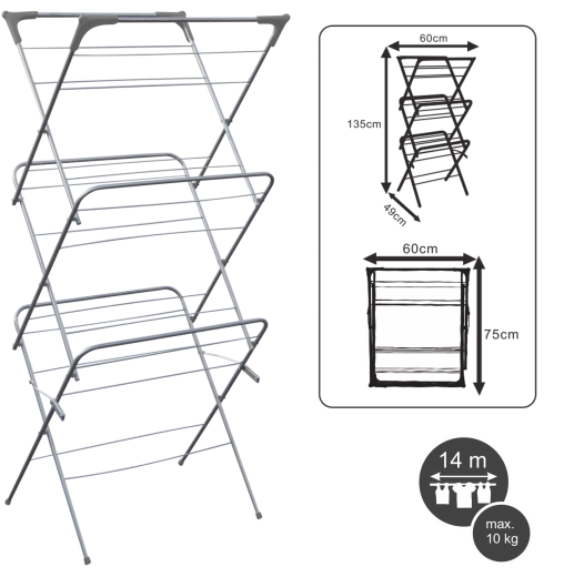 Praktický tříúrovňový sušák na prádlo CAMILLA šetří místo a umožní efektivně sušit velké množství oblečení i textilií. Díky kompaktním rozměrům se hodí na balkon, terasu i do menších bytů. Nabízí stabilní konstrukci, rychlé proudění vzduchu pro kratší dobu schnutí a snadné složení pro úsporu prostoru.