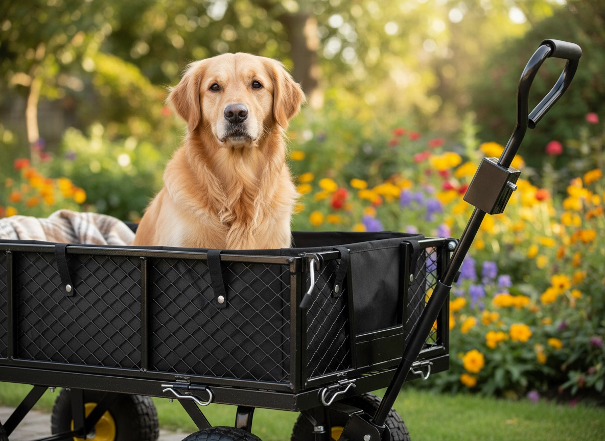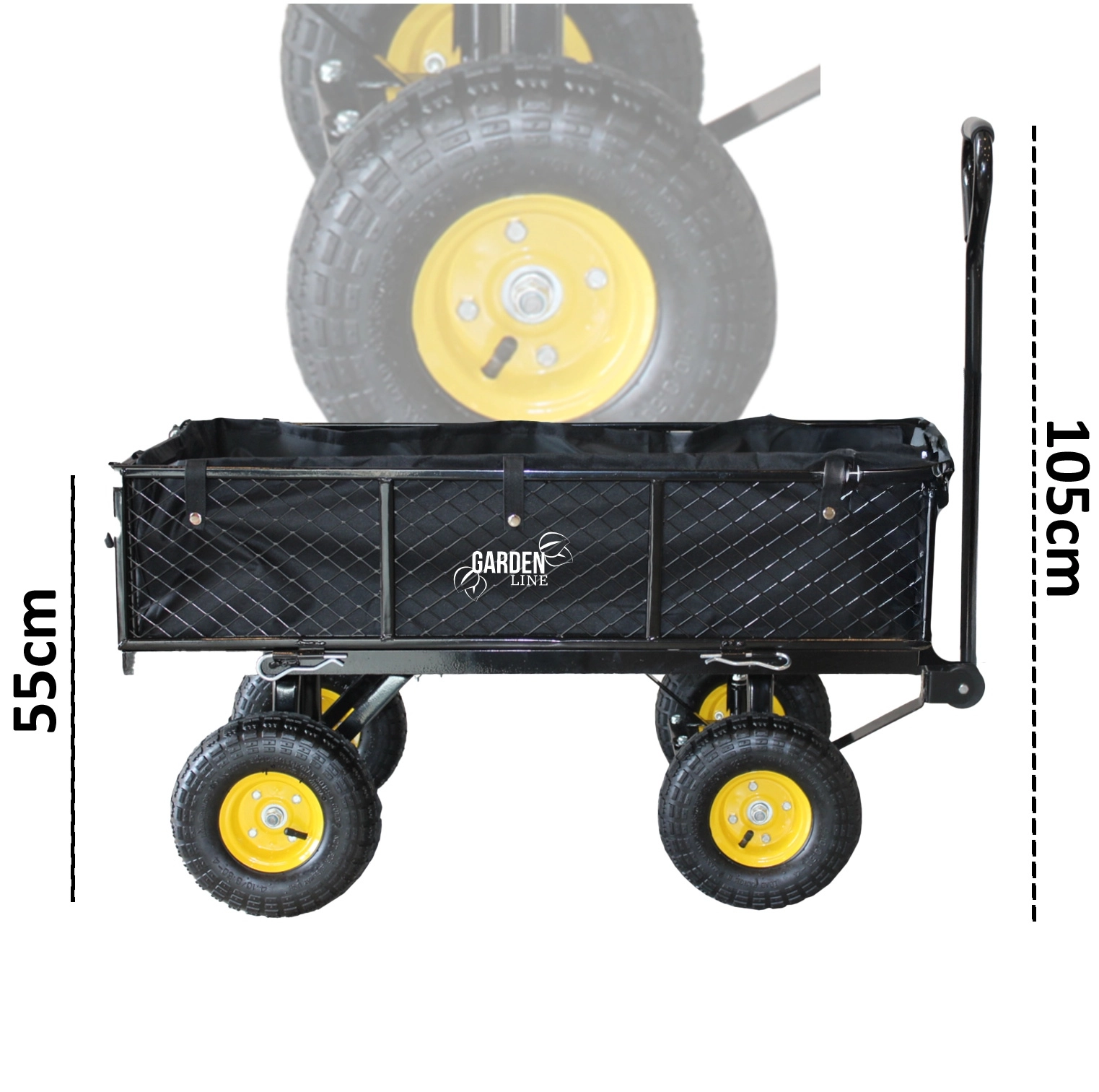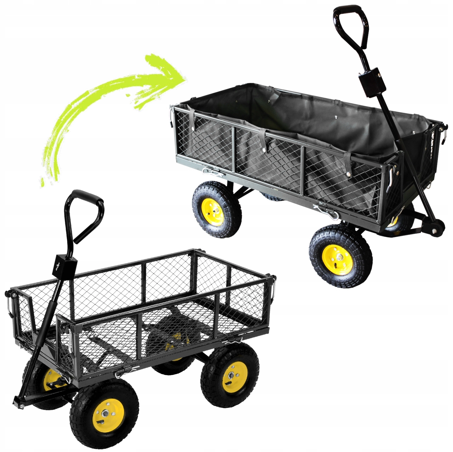 Robustní dvoufunkční zahradní vozík v elegantní černé barvě zvládne převoz nářadí, dřeva, hlíny i úrody až do 300 kg. Díky pneumatickým kolům s výrazným dezénem, otočné nápravě 180° a ergonomickému, protiskluzovému madlu se snadno ovládá v zahradě, na stavbě i na nerovném terénu. Lze jej táhnout ručně nebo připojit za zahradní traktor či čtyřkolku pro maximální efektivitu.