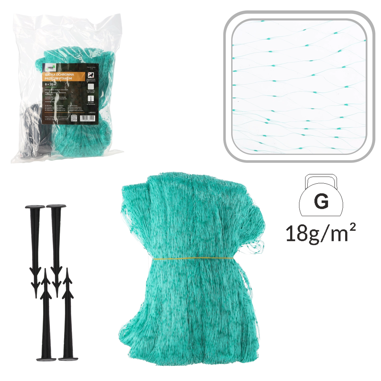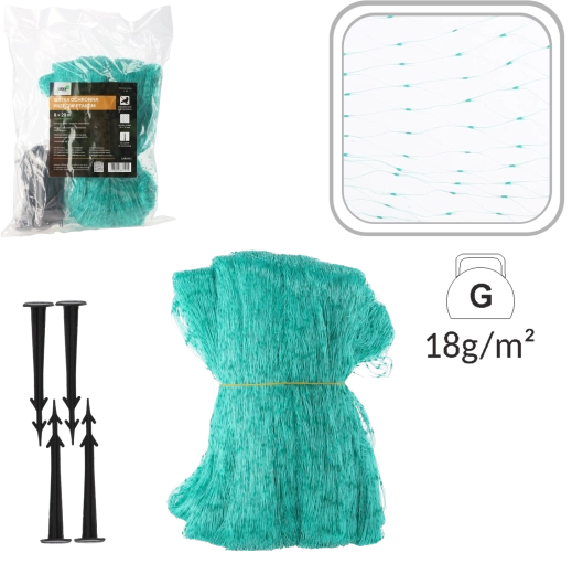 Odolný polypropylen zaručuje dlouhou životnost a možnost používání po více sezón. Oka 35 × 35 mm účinně brání průniku ptáků, zároveň však umožňují rostlinám dýchat a propouštějí světlo i déšť. Instalace je rychlá a snadná – s 16 kotevními kolíky síť pevně zajistíte k zemi či konstrukci.