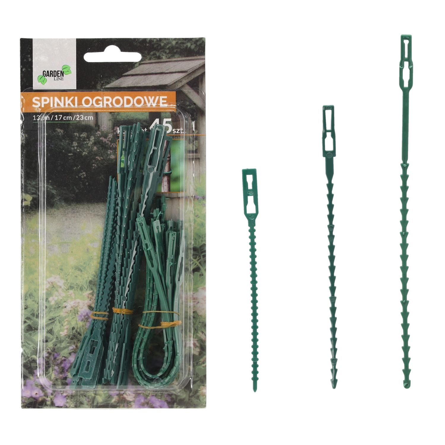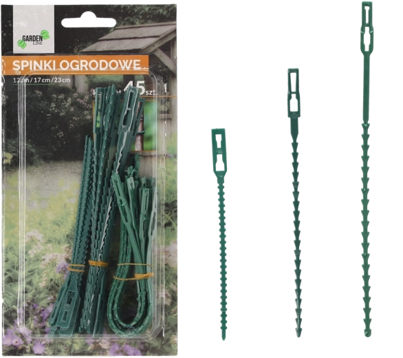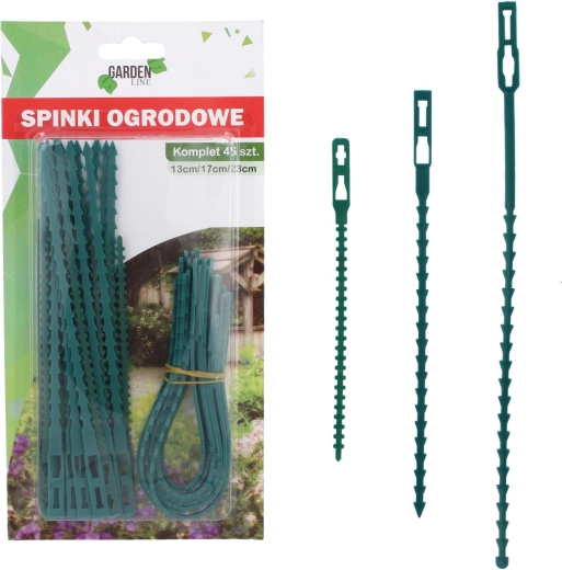 Praktická sada 45 zahradních sponek o délkách 13, 17 a 23 cm pro spolehlivé upevnění rostlin k oporám bez poškození stonků. Odolný a pružný plast zajistí opakované použití, zatímco zelená barva nenápadně splyne se záhony, skleníkem i balkonem.