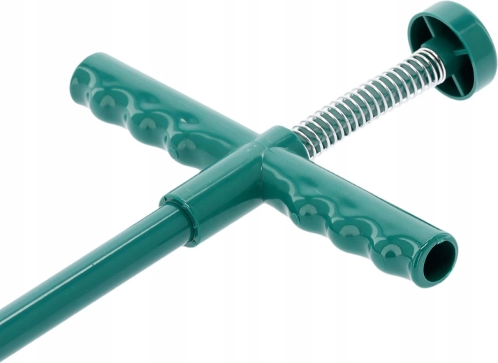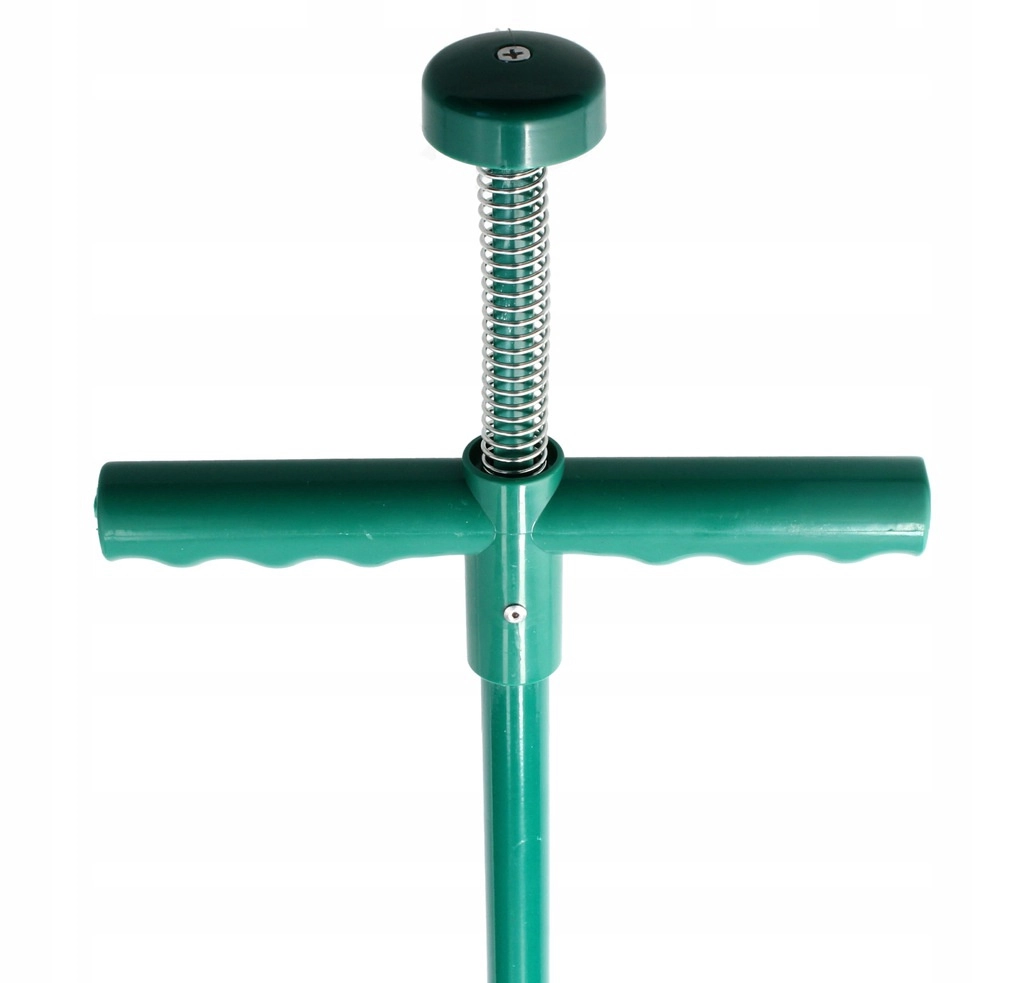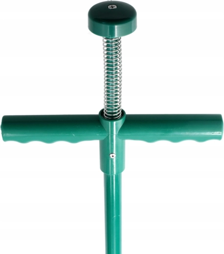 Široká T‑rukojeť z plastu v kombinaci s pružinovým mechanismem usnadňuje pootočení a uvolnění plevele bez zbytečné námahy.