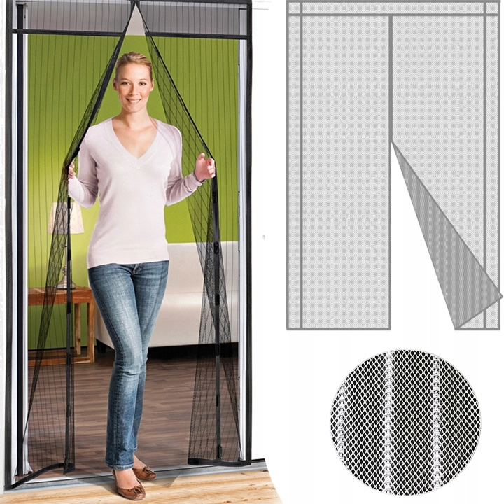 Instalace je rychlá a bez vrtání – jednoduše připevníte kolem rámu dveří. Síť lze zastřihnout pro perfektní usazení do šířek 80/90/100 cm a výšek 200/210 cm. Magnetické zapínání zajišťují po celé délce panely a pomocné magnety, takže síť spolehlivě drží zavřená i při častém průchodu dětí či domácích mazlíčků.