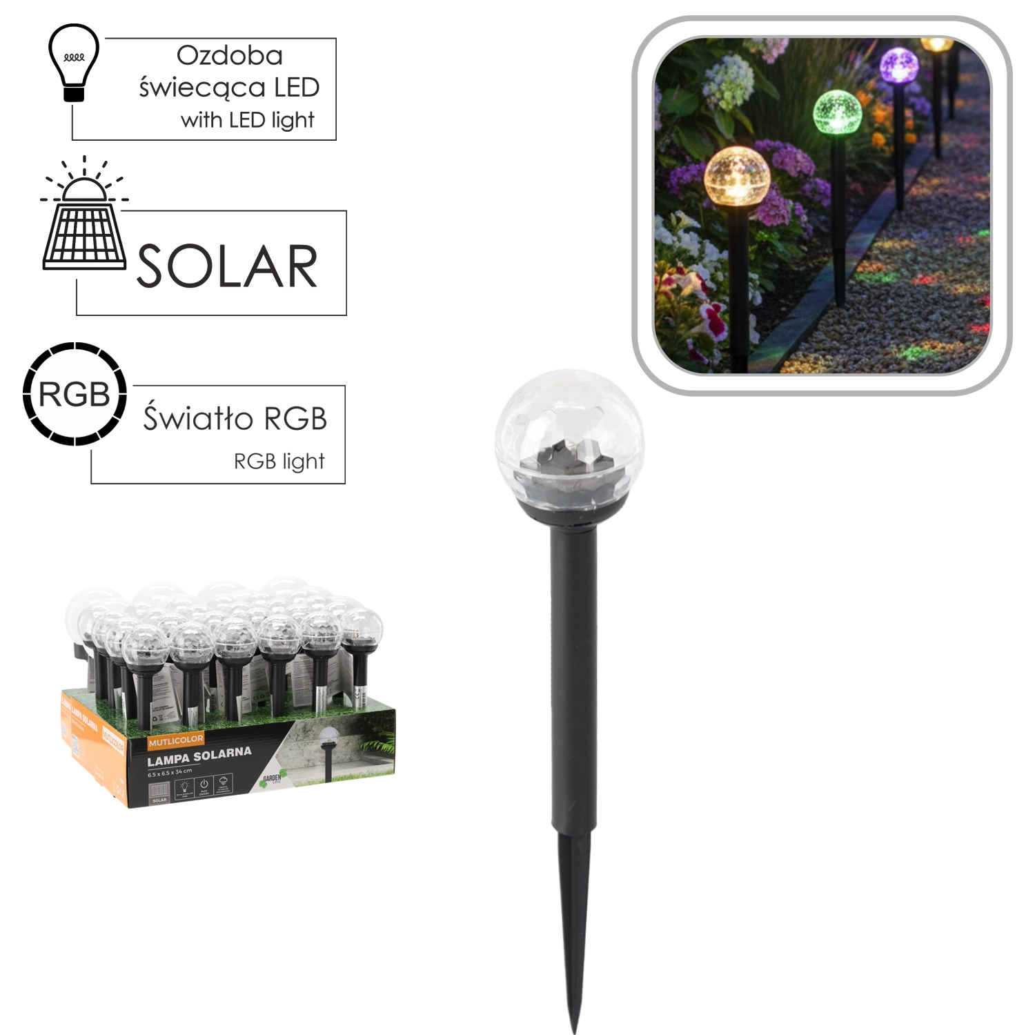 Vytvořte si atmosféru na zahradě, terase nebo podél příjezdové cesty. Solární lampa s RGB LED mění barvy a podtrhuje vzhled zahradní architektury, jezírek i rostlinných kompozic. Funguje zcela bez kabeláže – energii získává ze slunce, takže nevyžaduje žádné dodatečné náklady.