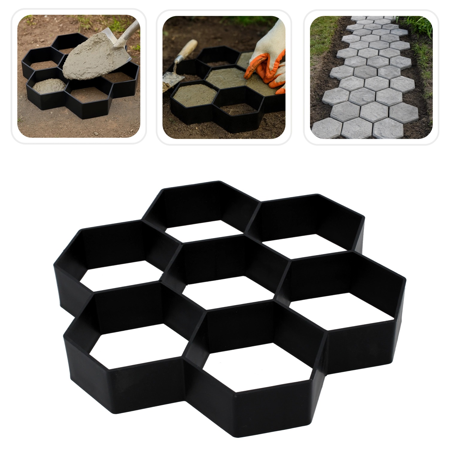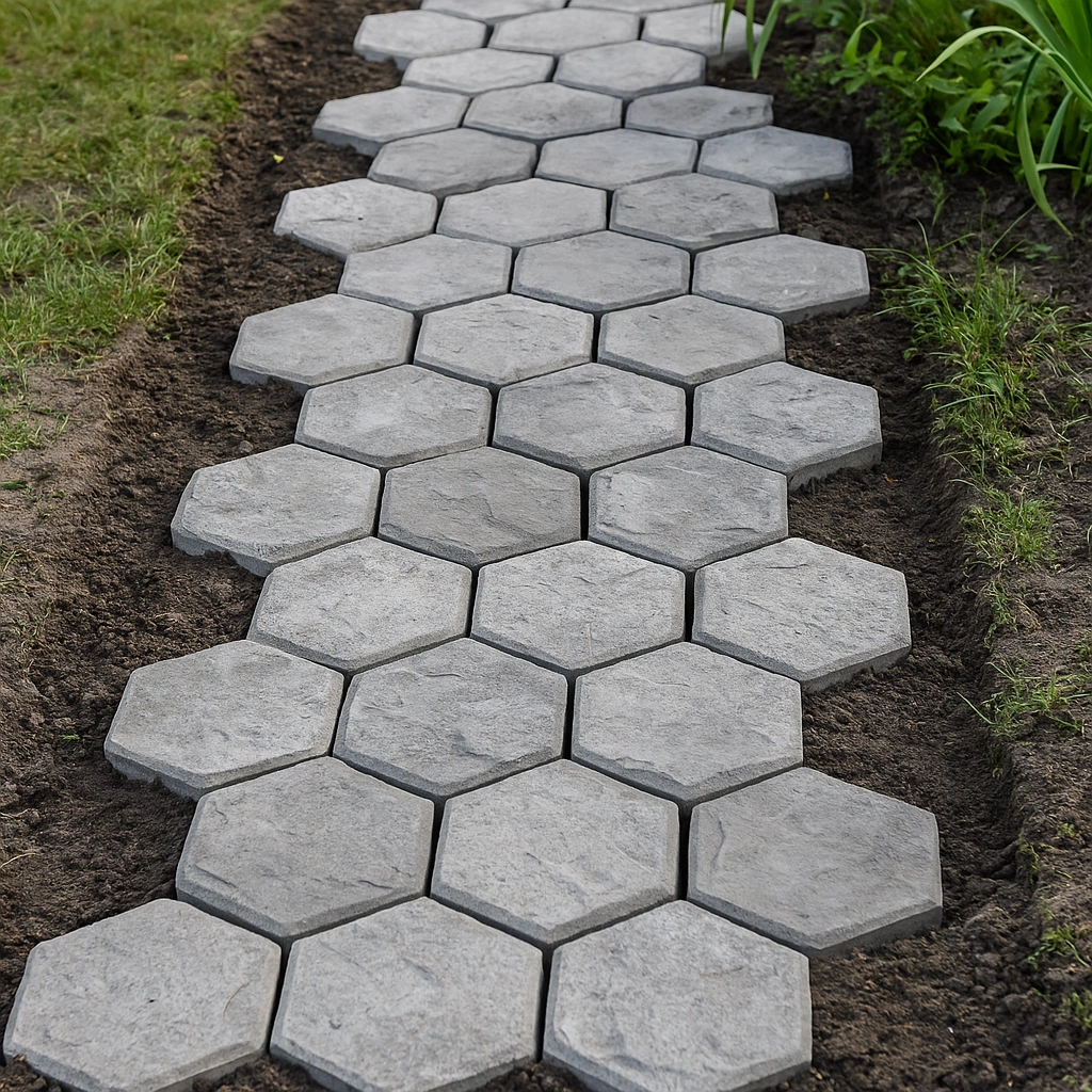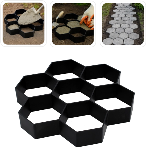 Forma je připravena pro rychlé a čisté lití betonu. Stačí ji položit na podklad, vyplnit směsí, uhladit a po zavadnutí zvednout – tvar lze snadno opakovat a skládat do různých vzorů. Díky univerzálním rozměrům 29 × 29 × 4 cm snadno navrhnete chodník přesně podle prostoru i stylu zahrady.