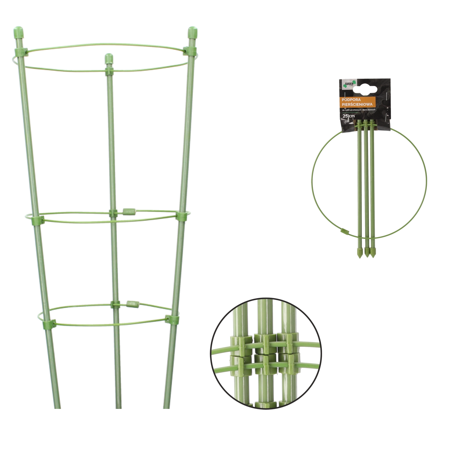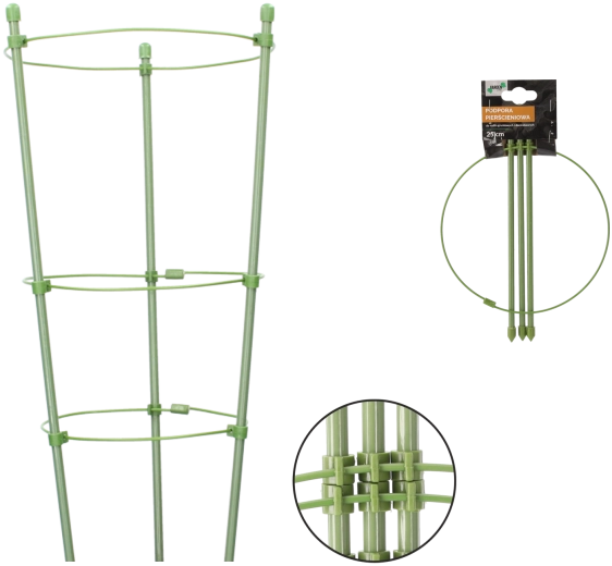 Tato kruhová opora je ideální pro pěstování na záhonech i v květináčích. Odolná ocel s polyetylenovým povlakem zajišťuje dlouhou životnost a odolnost vůči povětrnostním vlivům. Zabraňuje pokládání rostlin k zemi a napomáhá rovnému, zdravému růstu bez lámání stonků.