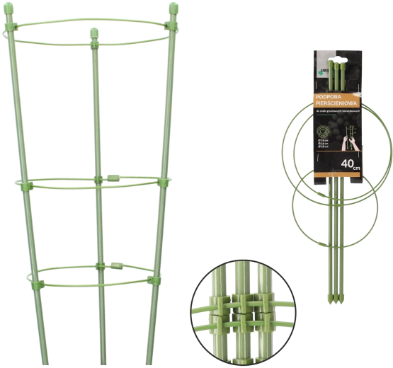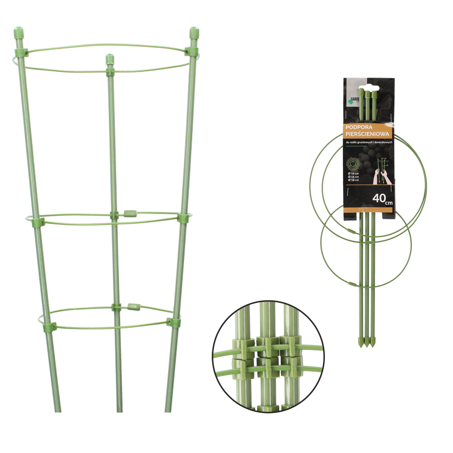 Tato kruhová opora se třemi prstenci je skvělým řešením pro pokojové rostliny, zahradní záhony i menší keře. Pevná ocel s polyetylenovým povlakem odolává povětrnostním vlivům a mechanickému opotřebení, zatímco zelené provedení zůstává na záhonu téměř neviditelné.