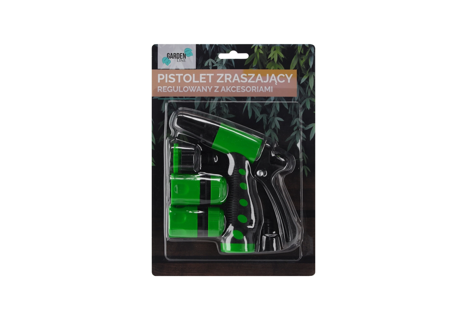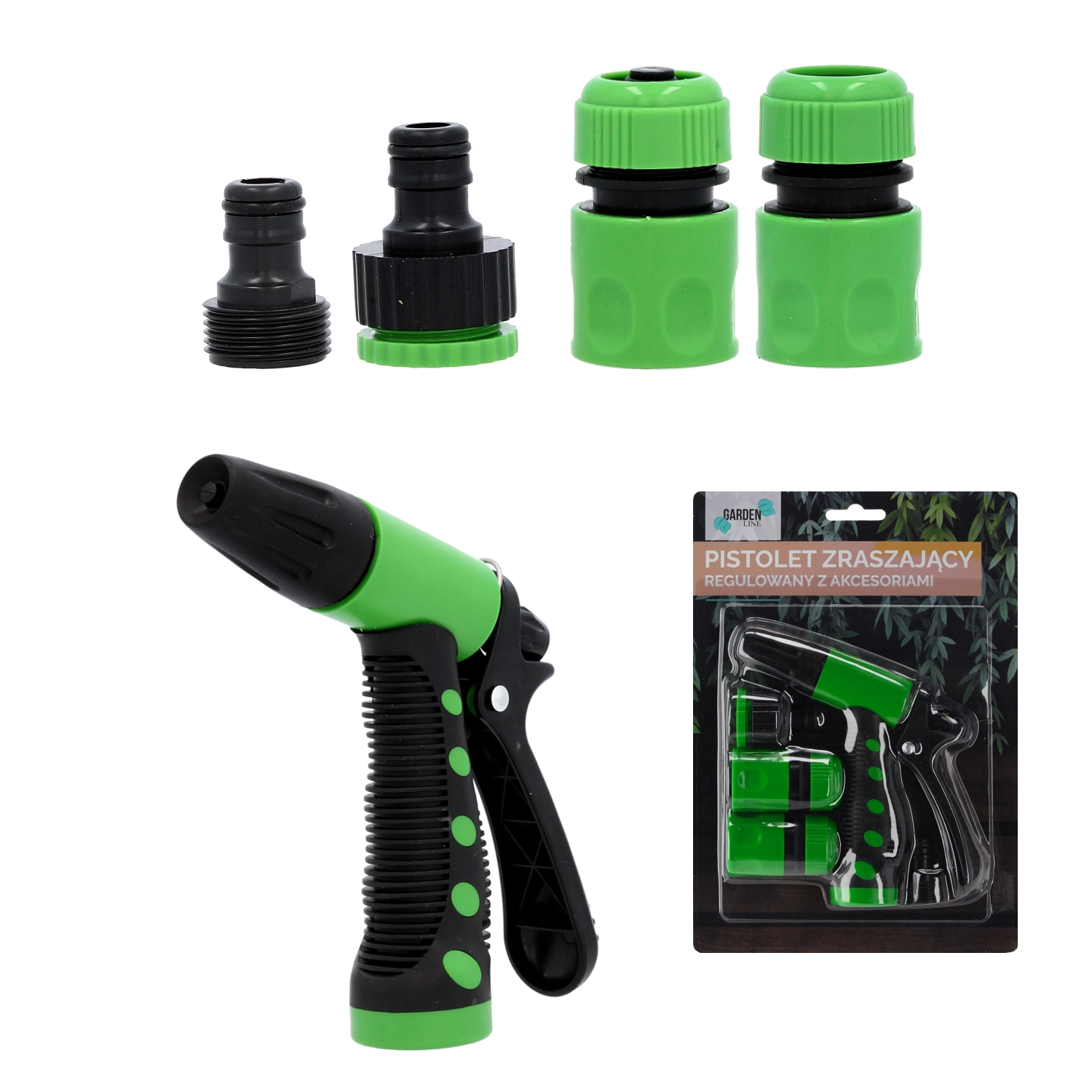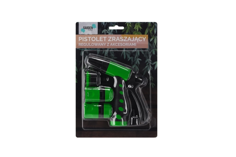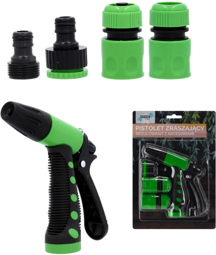 - Regulovatelná postřikovací pistole; rychlospojka 1/2" se stopem; rychlospojka 1/2" bez stopu; adaptér na kohoutek 1/2"–3/4"