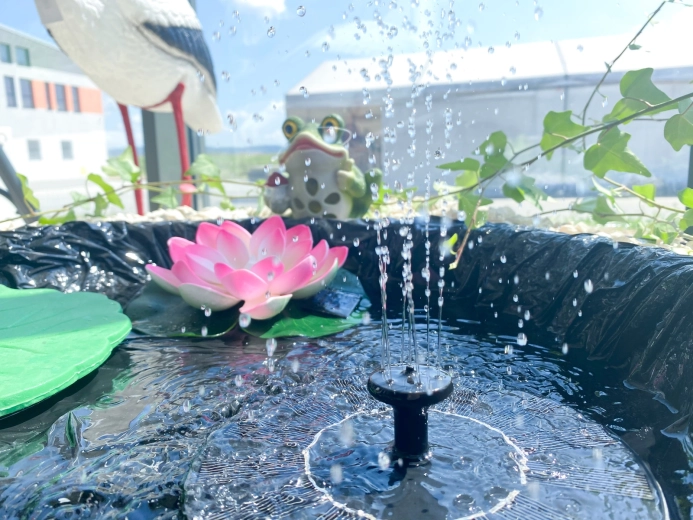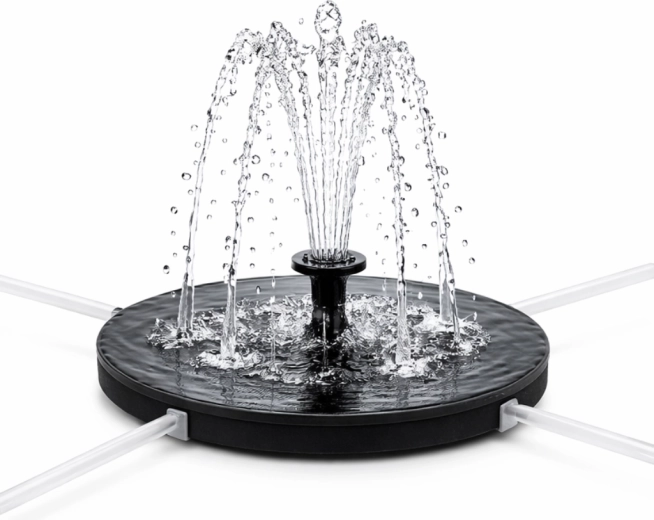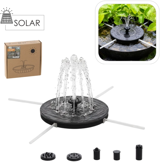 V balení naleznete více nástavců trysky pro různé tvary vodních efektů. Fontána je skvělou volbou pro slunná místa, kde není přístup k zásuvce – na terasy, k jezírkům nebo do ptačích koupelí.