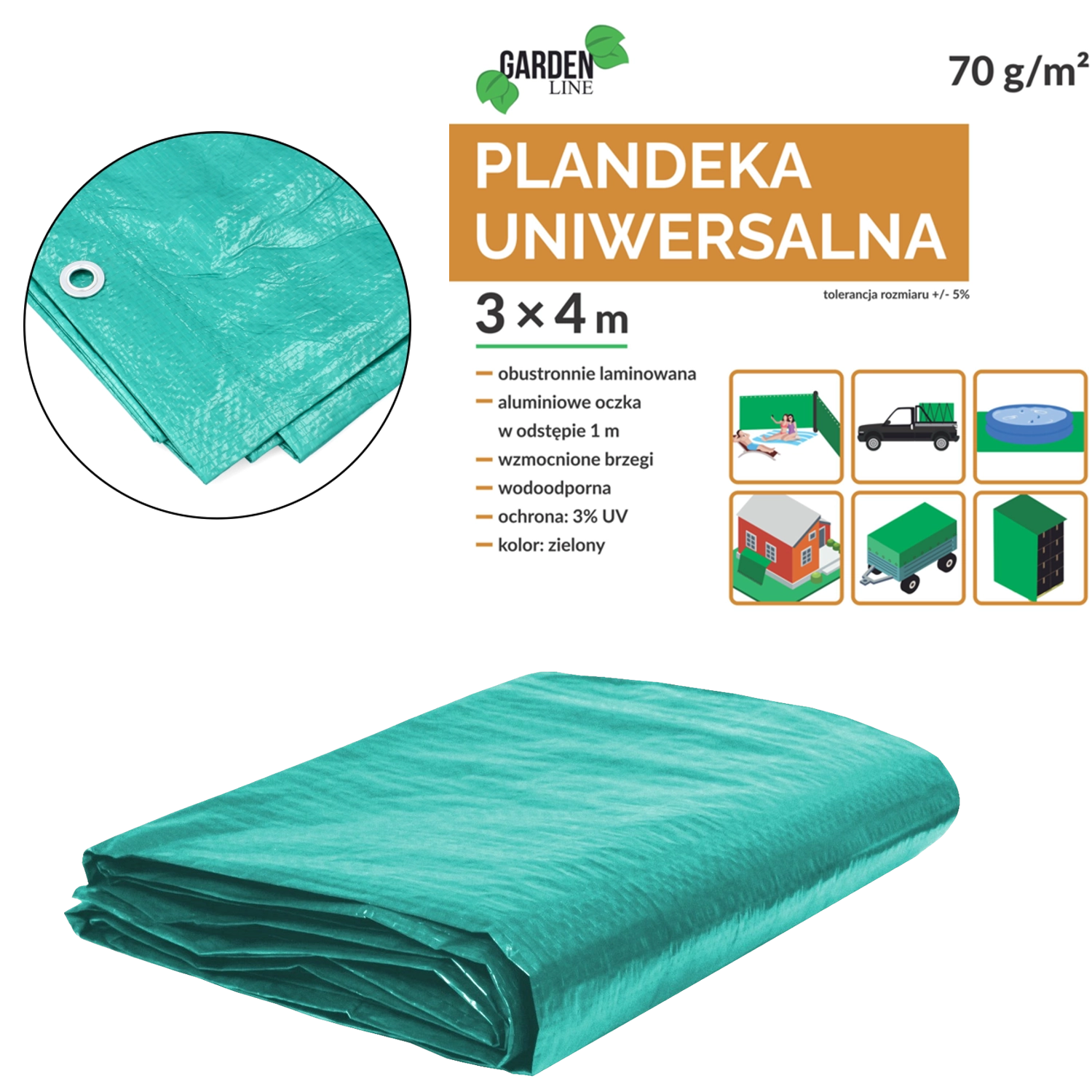 Po obvodu rozmístěná hliníková oka usnadňují rychlé a pevné uchycení pomocí lan či gumolan. Zesílené okraje s polypropylenovým lankem zvyšují odolnost proti natržení a větru, takže plachta spolehlivě drží i v náročnějších podmínkách.