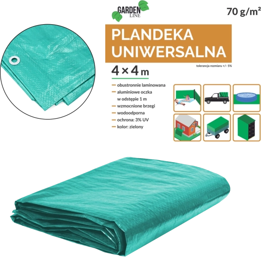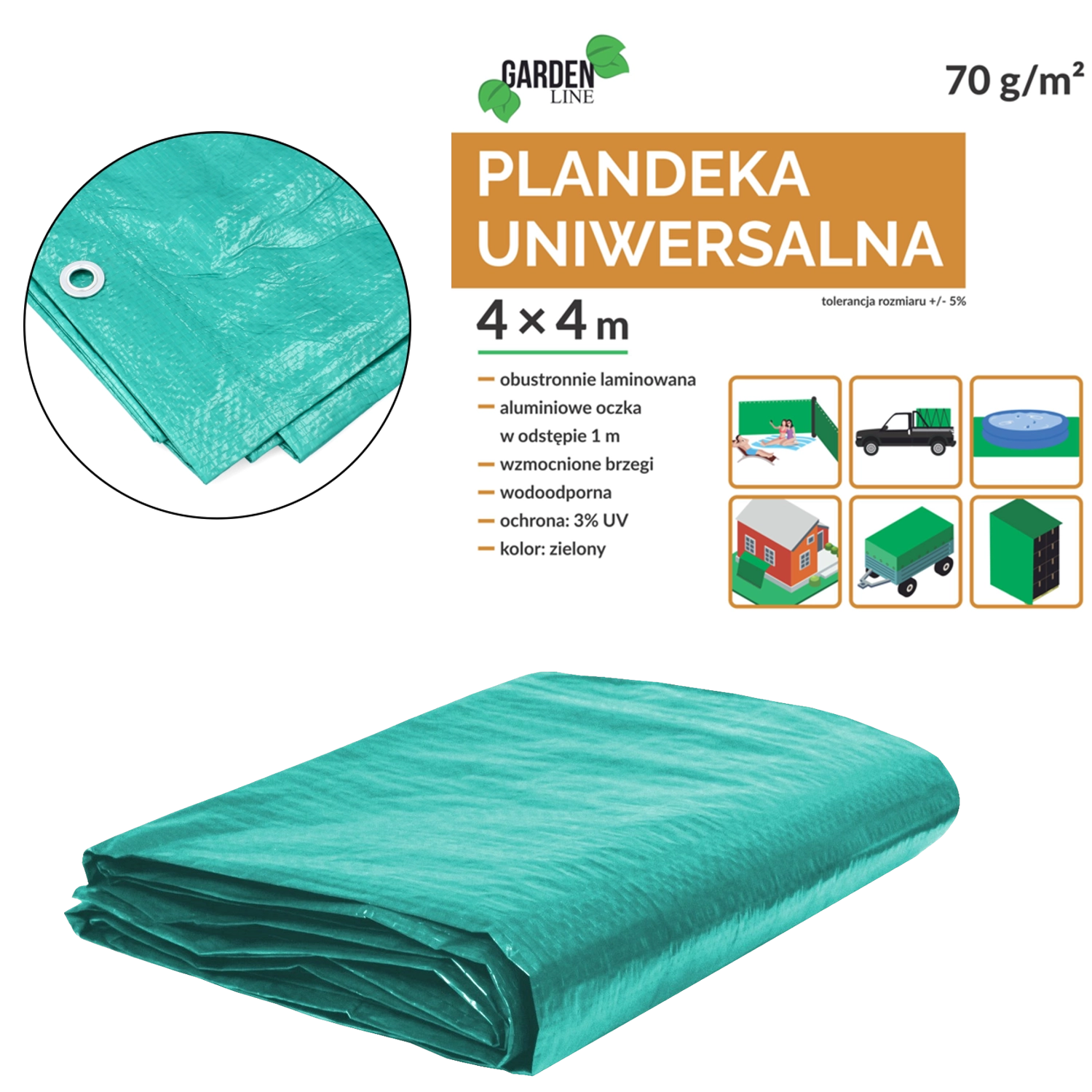 Univerzální krycí plachta z kvalitního PE o gramáži 70 g/m² chrání před deštěm, prachem a sluncem. Je oboustranně laminovaná, se zpevněnými okraji se šňůrou a hliníkovými oky po 1 m. Zelené provedení, UV ochrana 3 %, rozměr 4 × 4 m (+/−5 %).
