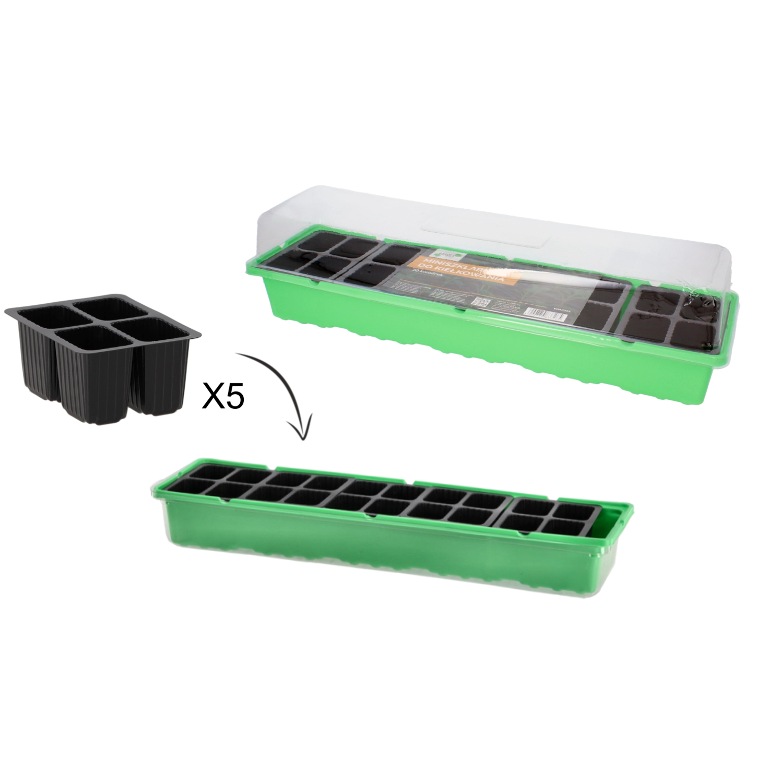 Segmentovaný tác s 20 buňkami umožňuje plánovat výsevy, oddělit odrůdy a jednoduše přesazovat bez poškození kořenů.