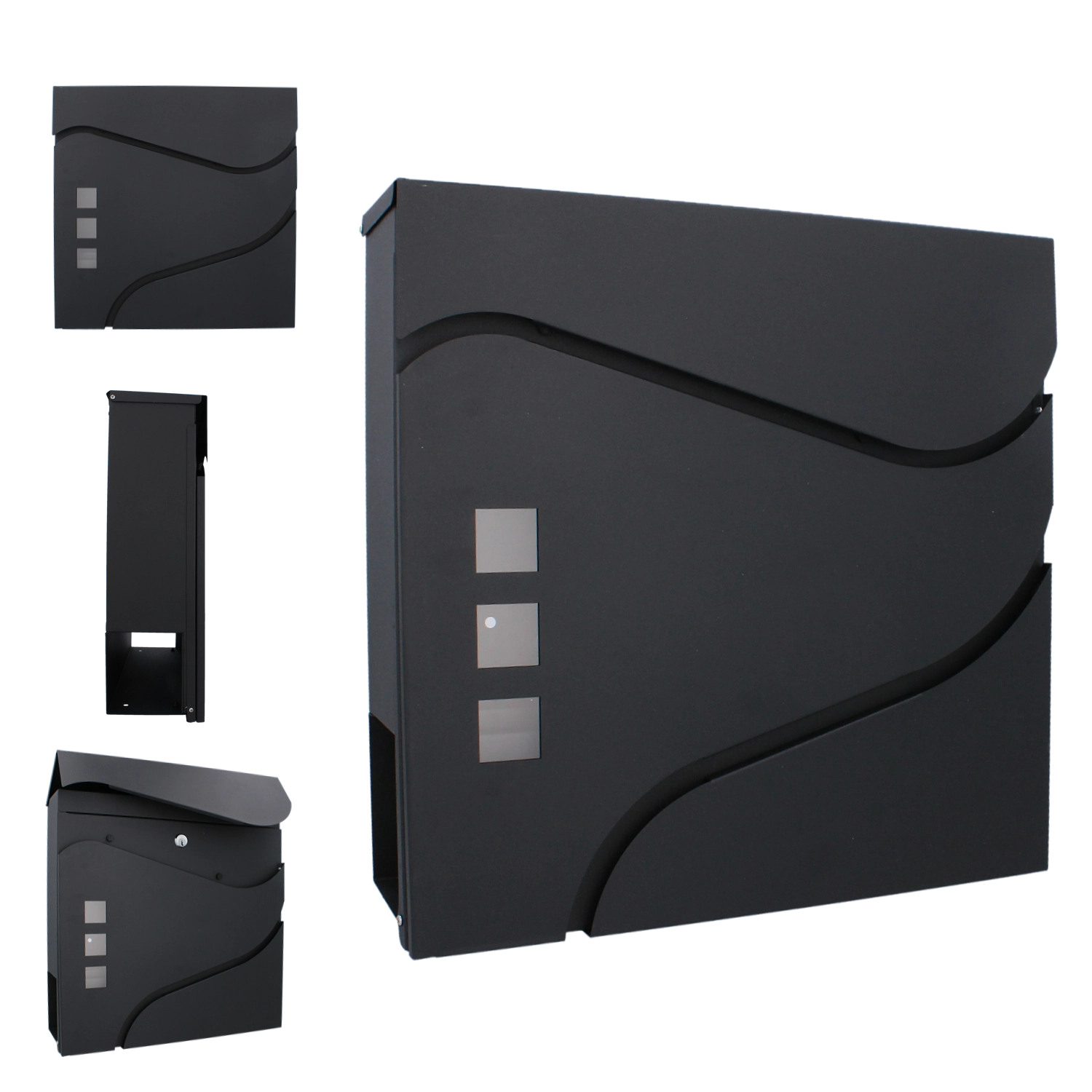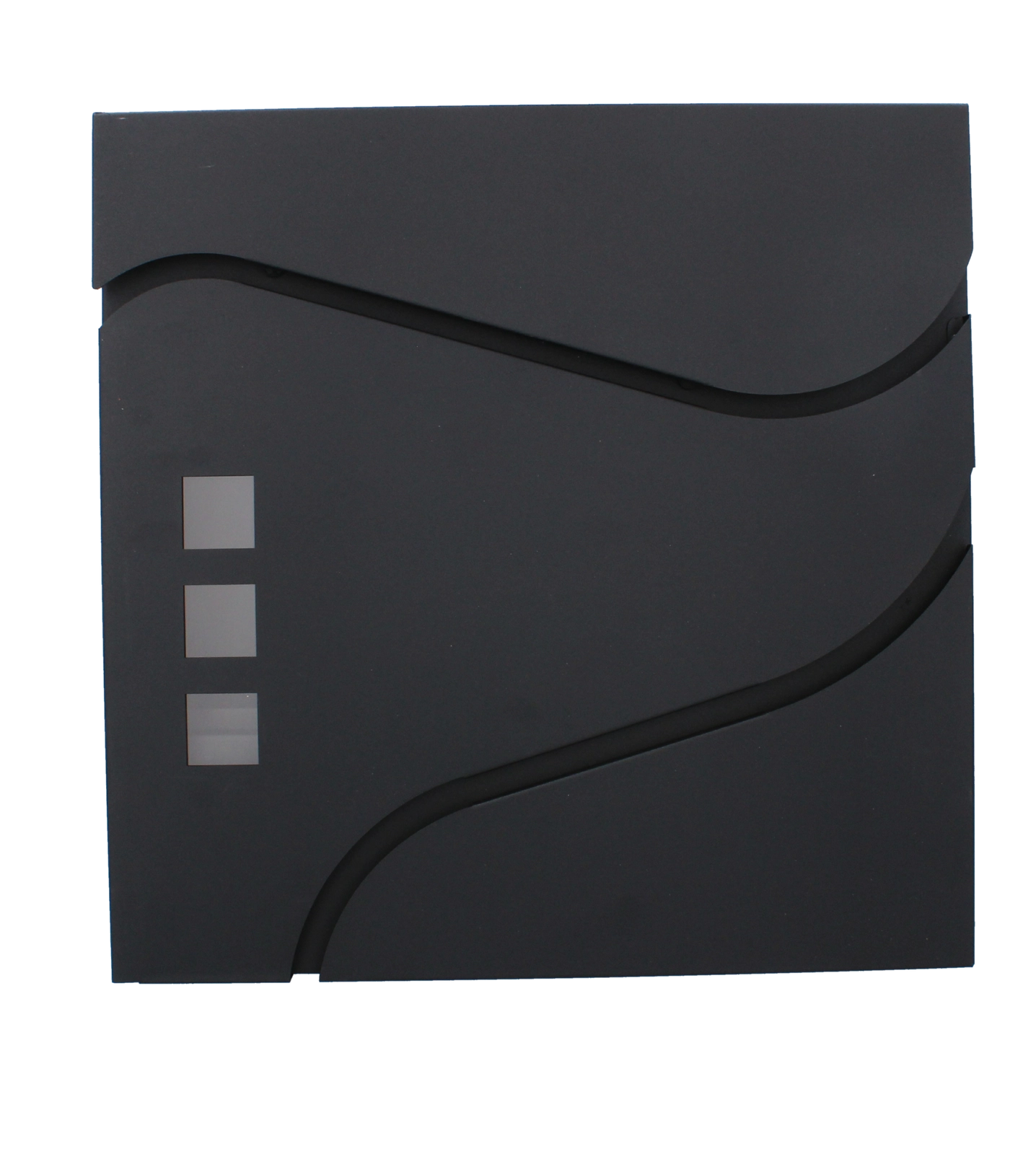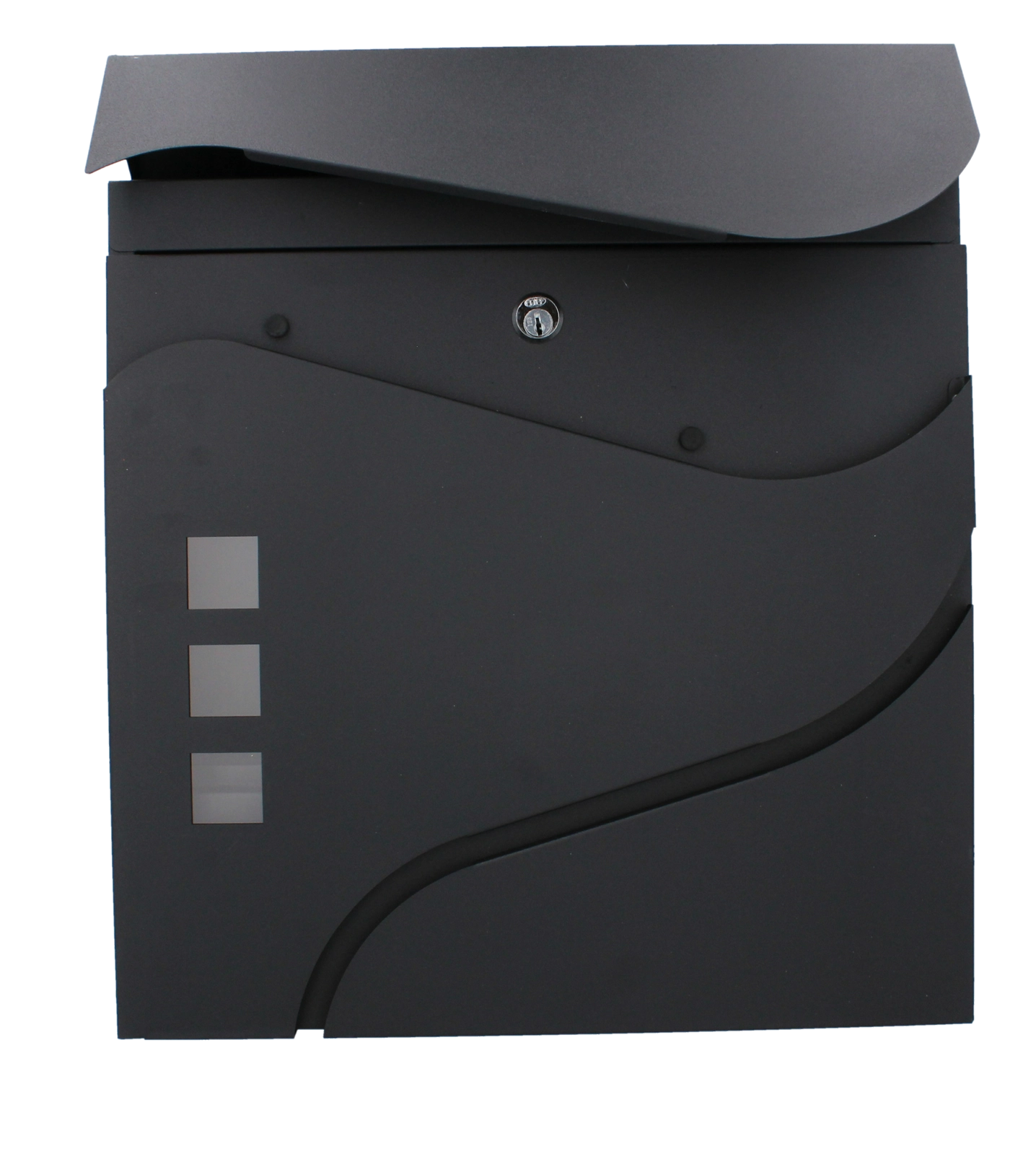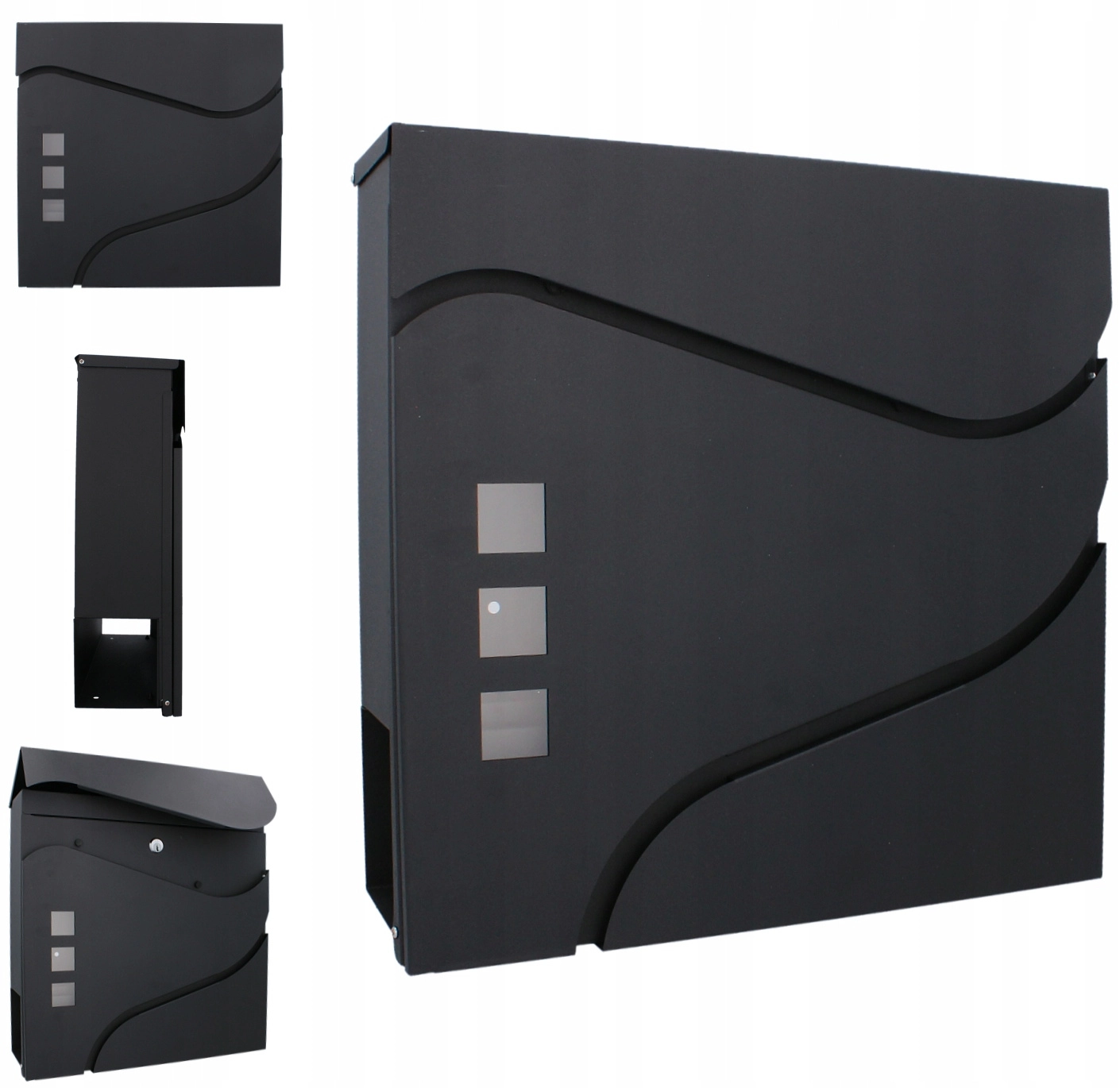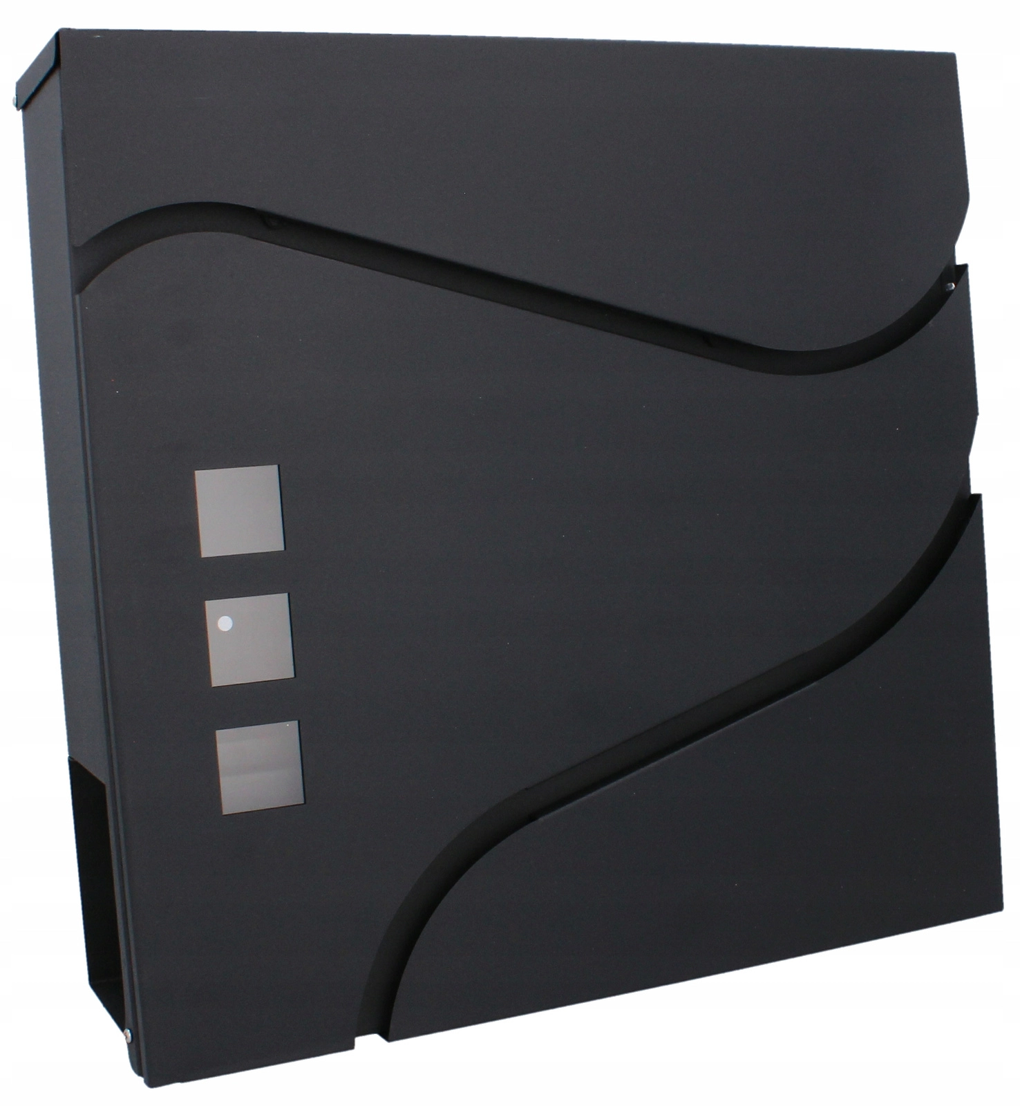 Elegantní minimalistický design s jemnými křivkami a třemi okénky doplní moderní fasády. Praktická boční či spodní novinová přihrádka (dle varianty) umožní oddělené uložení tiskovin. Montáž na zeď je rychlá díky předvrtaným otvorům.