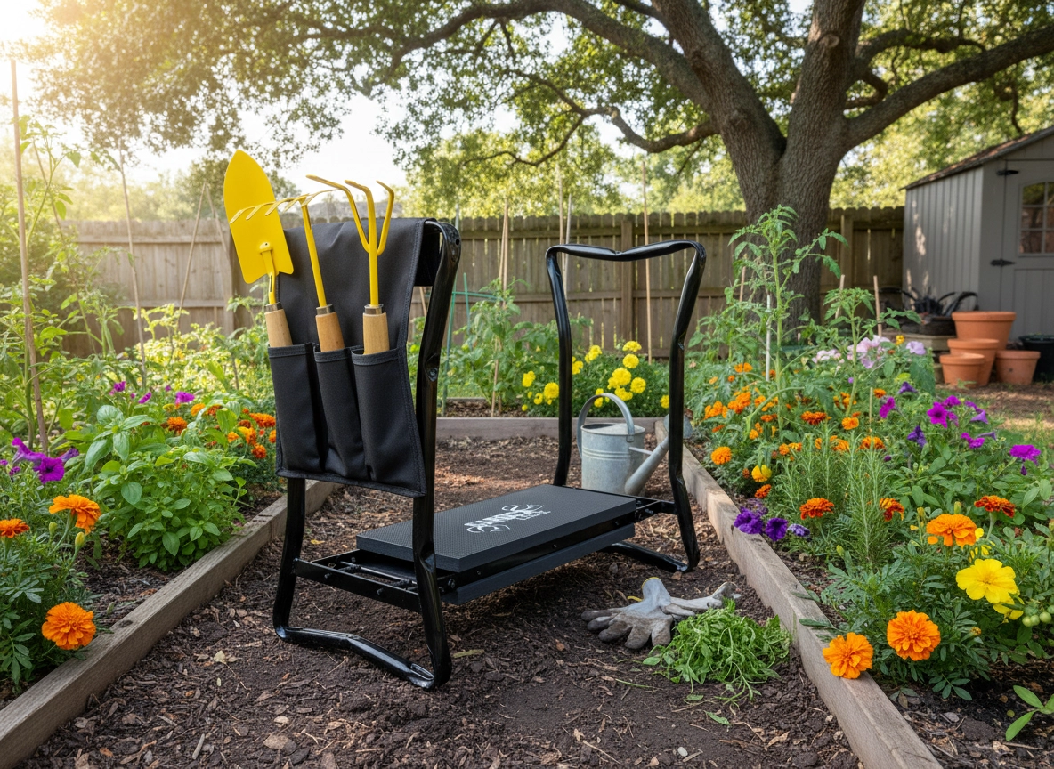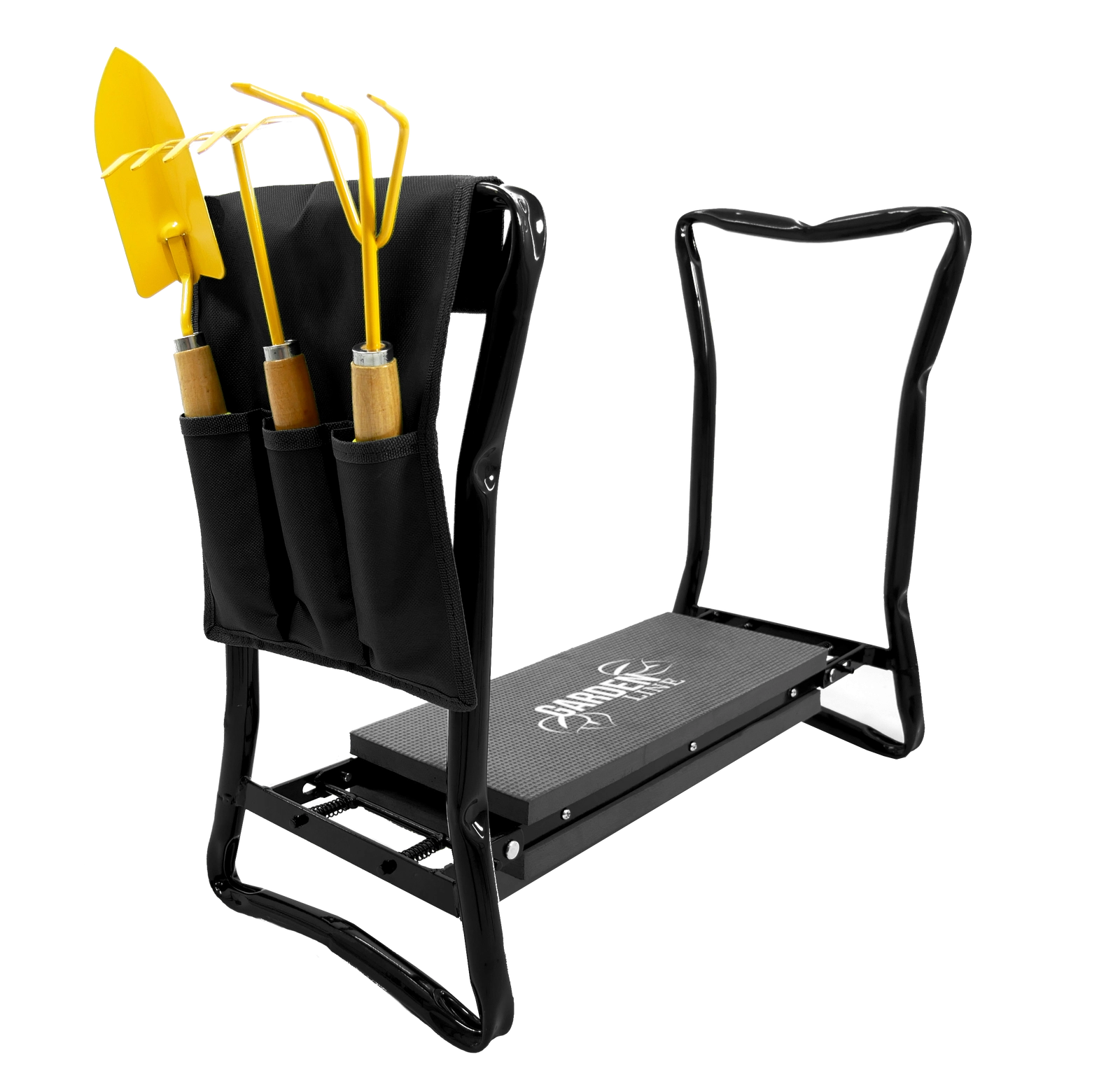 Univerzální zahradní pomocník 3 v 1: klekátko, sedátko a postranní organizér na nářadí. Pevný kovový rám s integrovanými madly usnadňuje vstávání, měkká EVA podložka chrání kolena a zvyšuje pohodlí. Konstrukce se rychle skládá naplocho pro snadné přenášení a úsporné uložení. Maximální nosnost 150 kg.