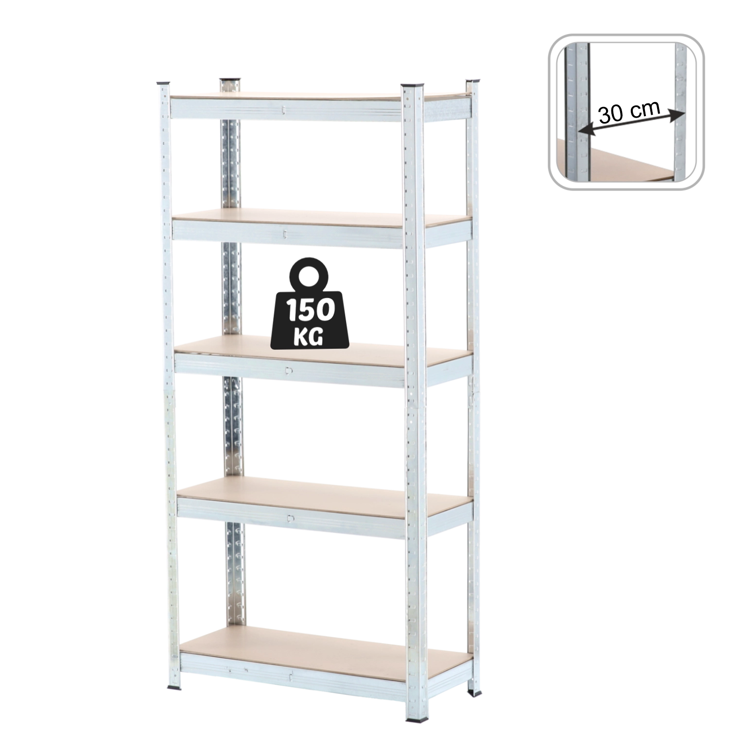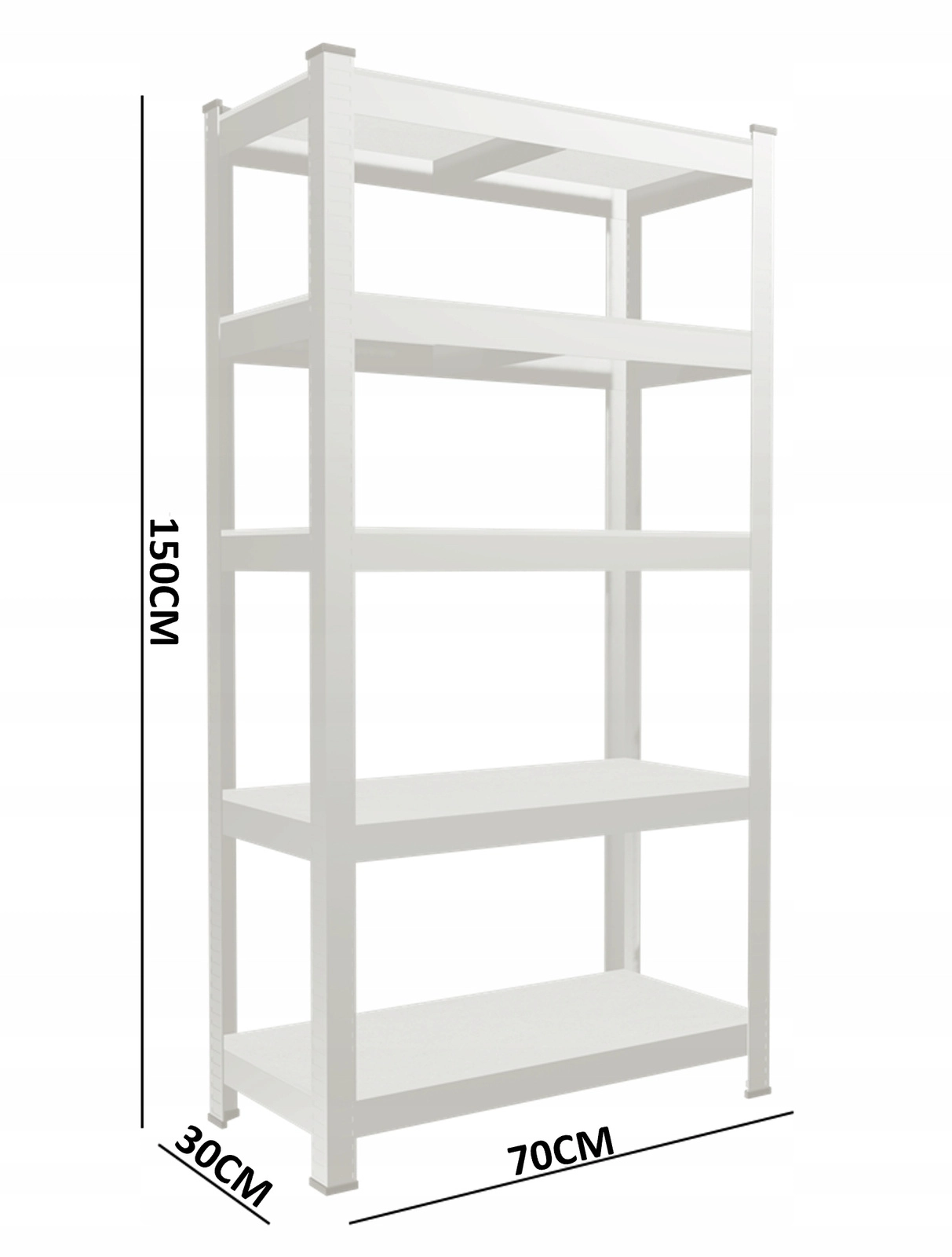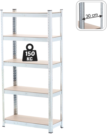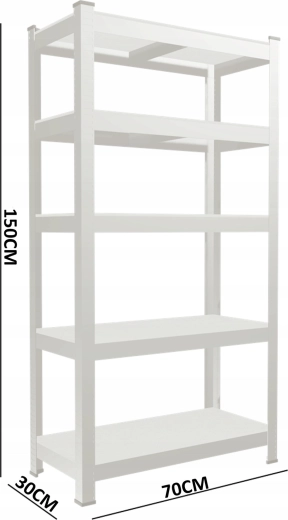 Praktický 5patrový kovový regál je navržen pro maximální stabilitu a dlouhou životnost. Masivní rám z oceli v kombinaci s odolnými MDF policemi zajistí spolehlivé uložení i těžších předmětů, přičemž každá police unese až 150 kg při rovnoměrném rozložení. Štíhlá hloubka 30 cm šetří místo a zároveň poskytuje dostatek úložné plochy.