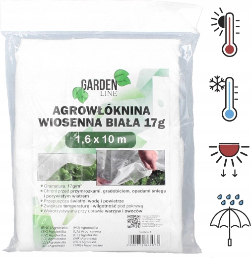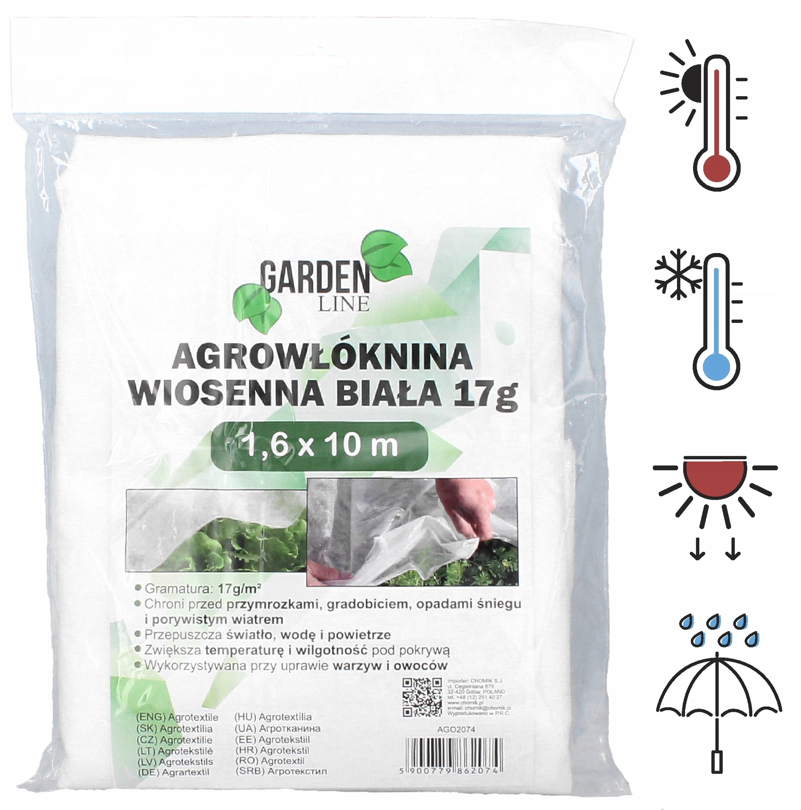 Lehká jarní agrotextilie o rozměru 1,6 × 10 m chrání mladé rostliny před chladem, větrem a srážkami a zároveň jim poskytuje ideální mikroklima. Materiál propouští světlo, vodu i vzduch, čímž podporuje zdravý růst, a pod krytem pomáhá udržet vyšší teplotu a vlhkost. Bílá barva odráží slunce a textilie je odolná vůči UV pro delší životnost.