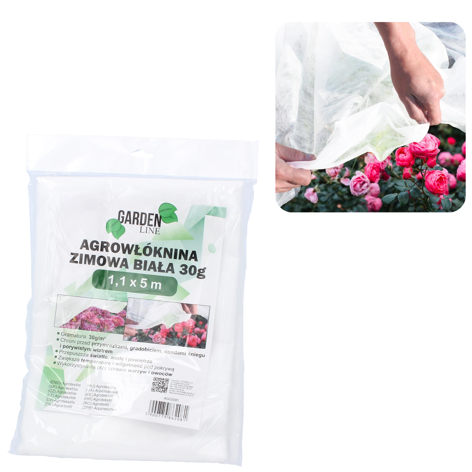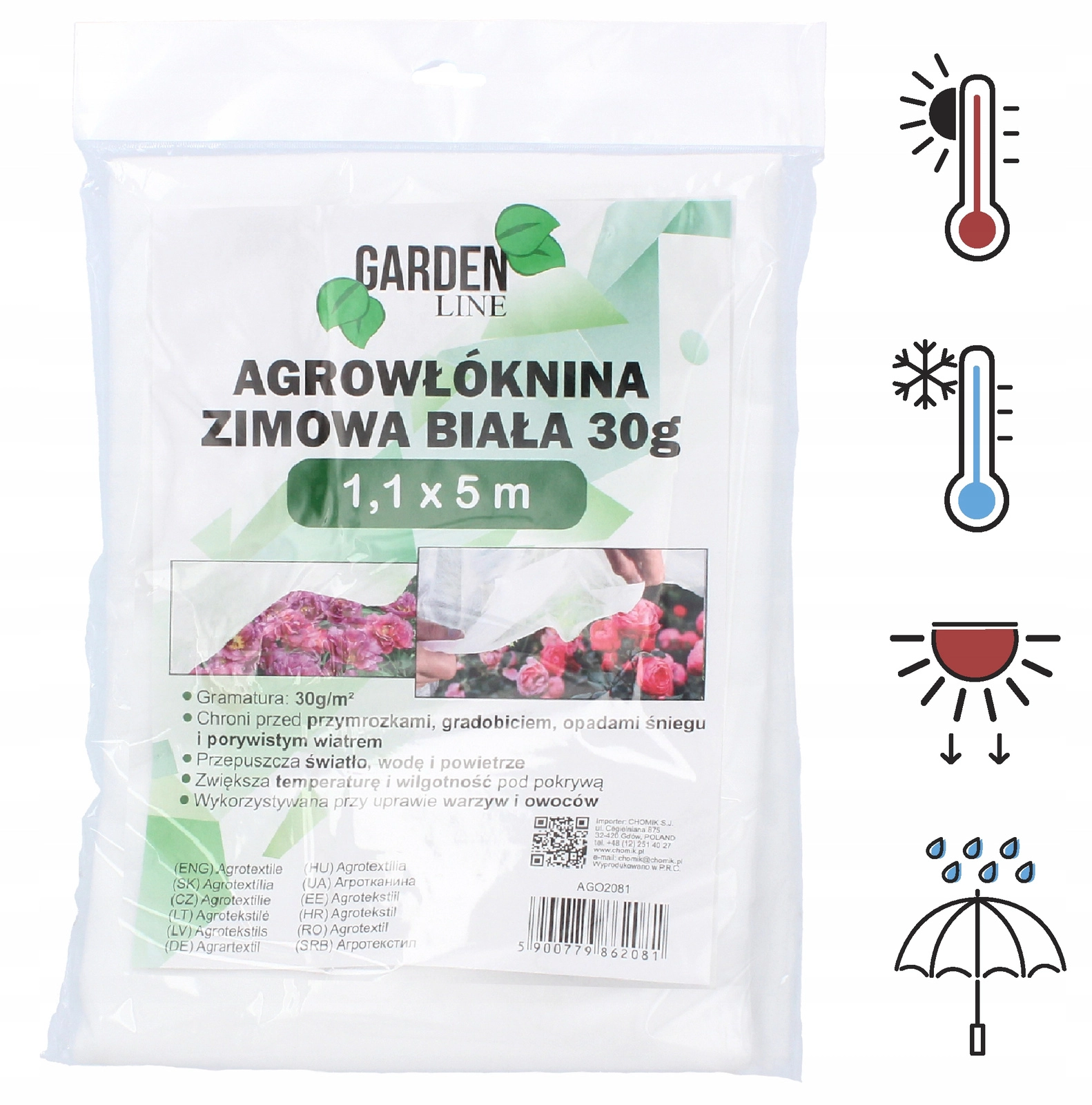 - Snadná instalace – přikrytí záhonu, fixace kolíky či zátěží.