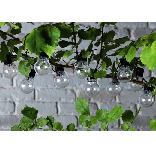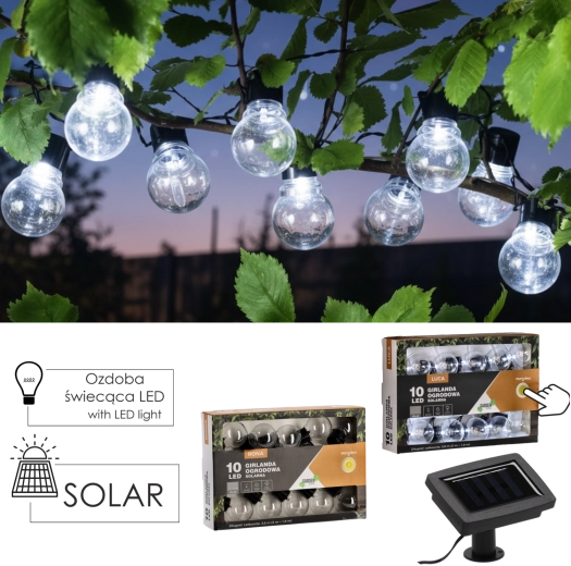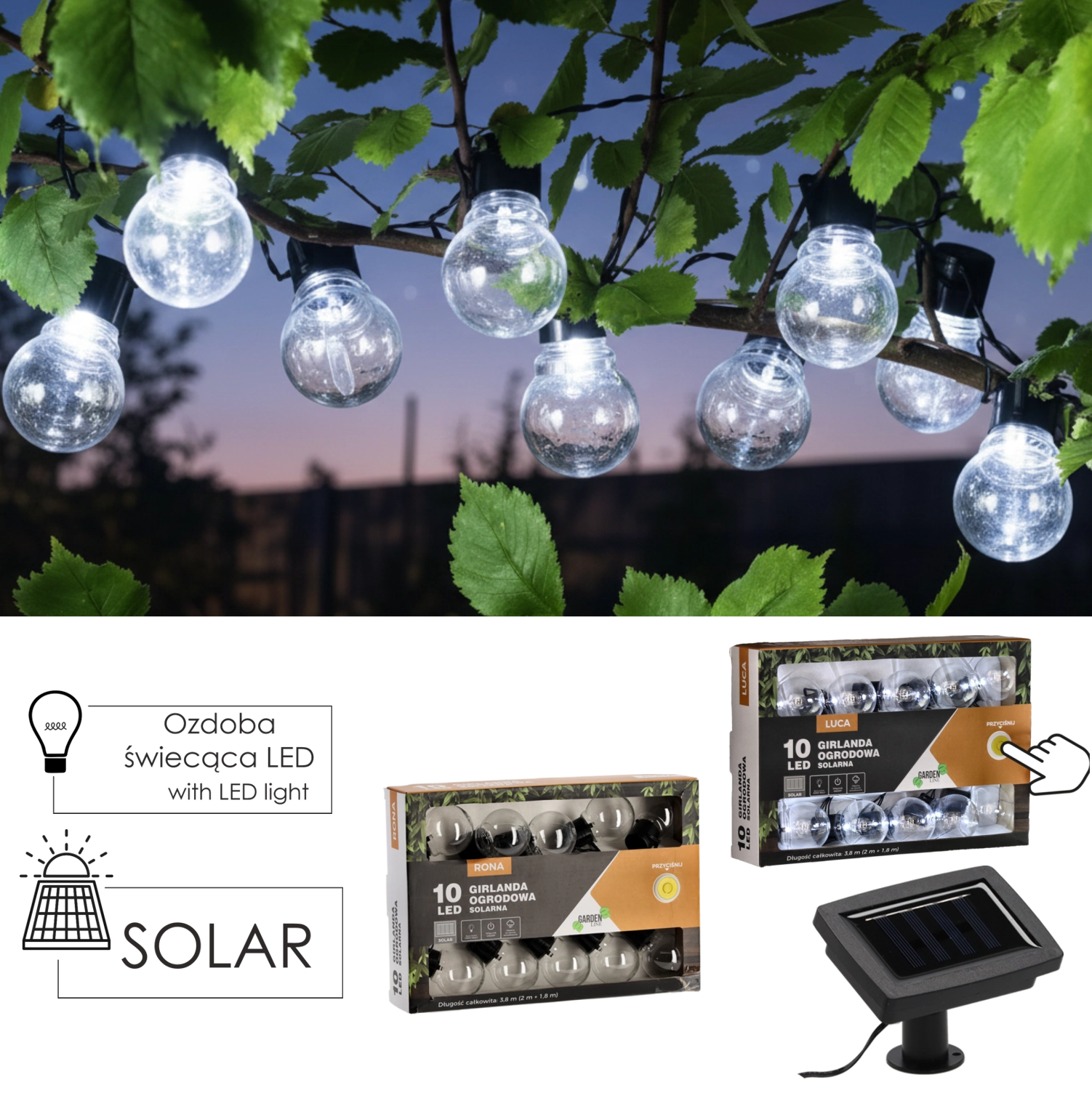 Solární girlanda LUCA s deseti LED žárovkami je ideální dekorace pro večerní posezení na balkonu, terase i v zahradě. Panel přes den sbírá energii ze slunce a večer ji promění v příjemné osvětlení bez nutnosti kabeláže a bez zvýšených nákladů na elektřinu. Stylová studeně bílá barva světla podtrhne moderní i klasický design prostoru.