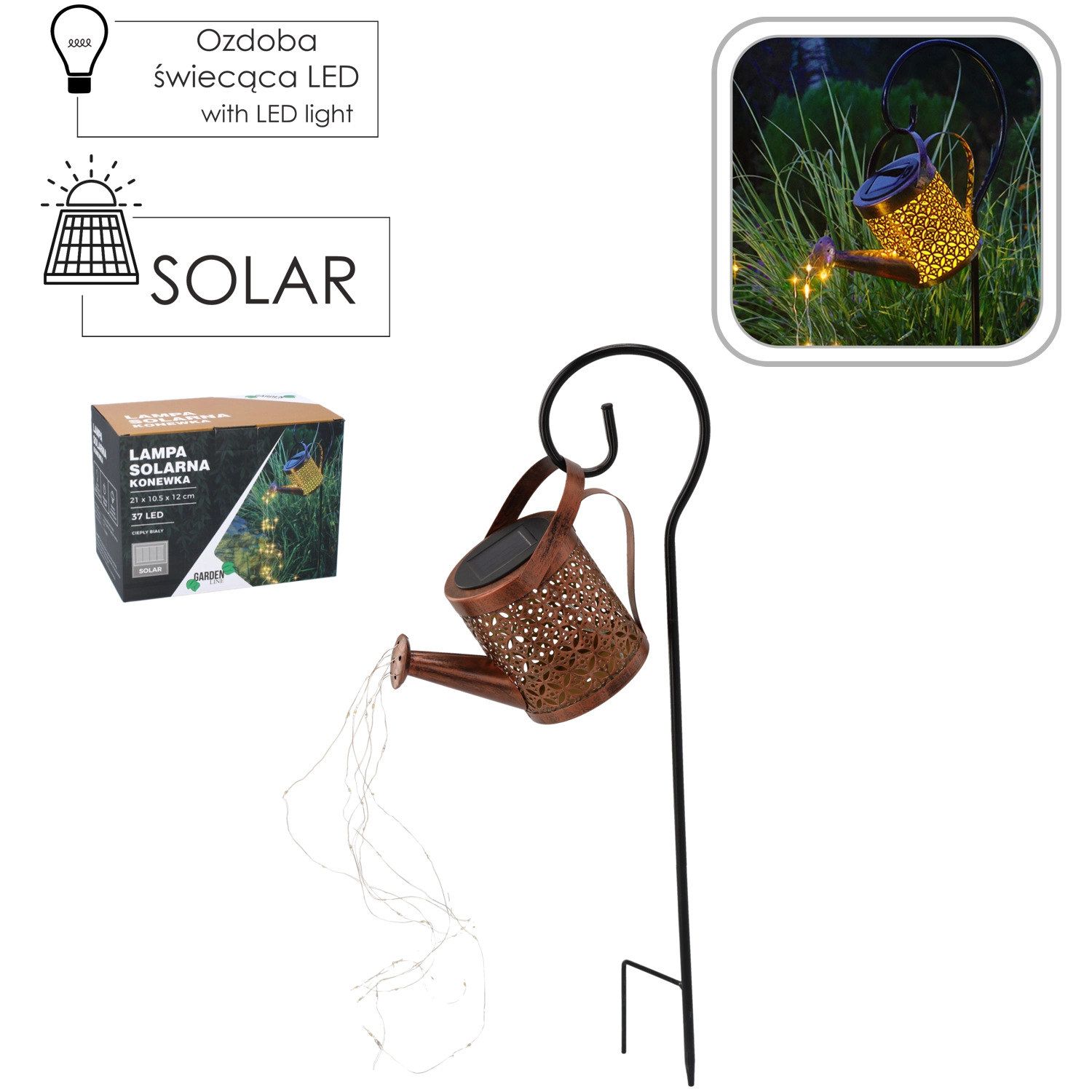 Lampa nabízí 37 LED v teplé bílé barvě, které po plném nabití svítí přibližně 6–7 hodin. Součástí je dobíjecí NI-MH akumulátor, ochrana IP44 proti stříkající vodě a praktický háček na zapíchnutém závěsném stojanu s celkovou výškou cca 80 cm. Kompaktní konvička (21 × 10,5 × 12 cm) se snadno umístí do záhonů, k jezírkům či na terasu.