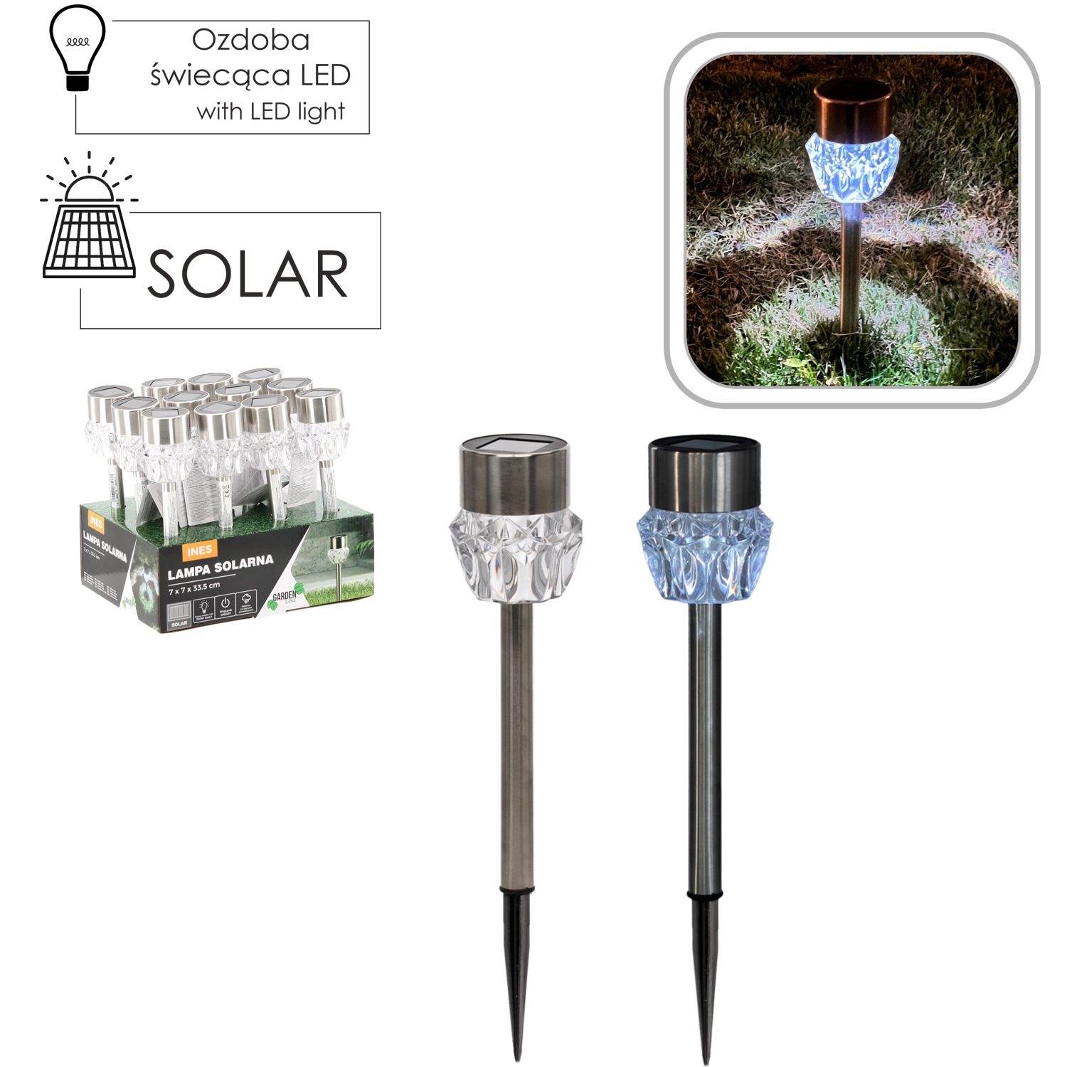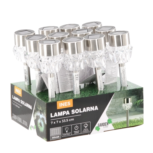 Elegantní solární zahradní lampa INES se stříbrným tělem a dekorativní čočkou rozzáří cesty, terasy i záhony. Díky solárnímu napájení nevyžaduje kabeláž ani další náklady, automaticky se rozsvítí po setmění a nabídne studeně bílou LED. Odolnost IP44 zajišťuje spolehlivý provoz za každého počasí.