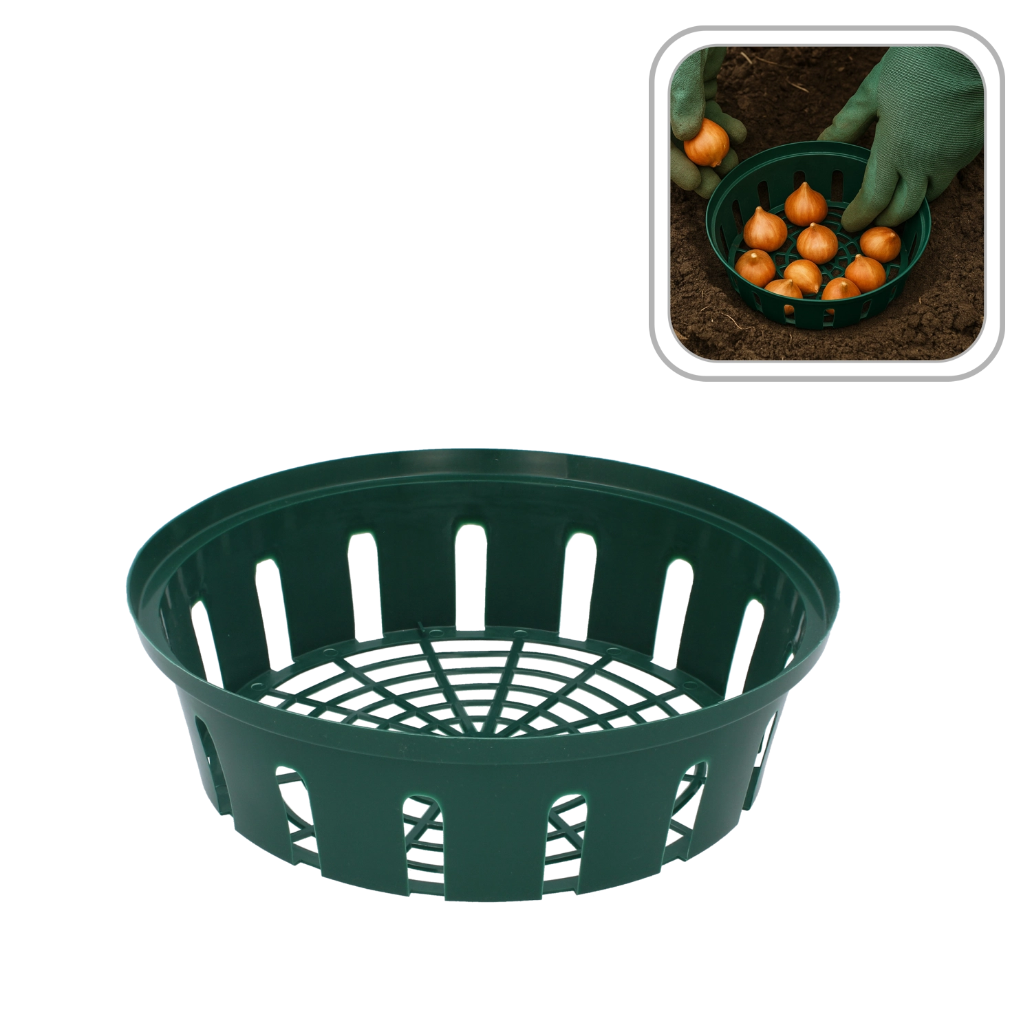 Udělejte z výsadby cibulovin rychlou a přehlednou práci. Tento košík chrání cibule před myšmi, hraboši i krtky, usnadňuje přesné rozmístění a po odkvětu dovolí cibule pohodlně vyjmout i se substrátem. Perforace zajišťuje optimální proudění vzduchu a odtok přebytečné vody, což podporuje zdravý růst rostlin.