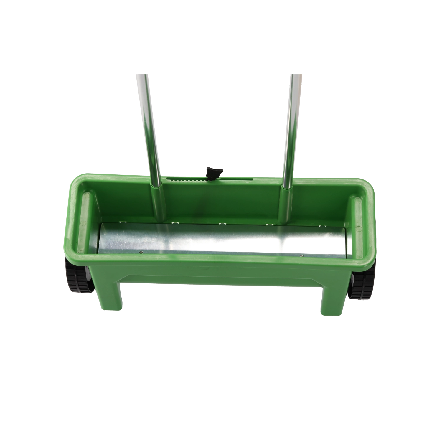 Násypka z polipropylenu je odolná proti povětrnosti i nárazům. Velká kola zajišťují stabilní jízdu a plynulé vedení na různých površích.