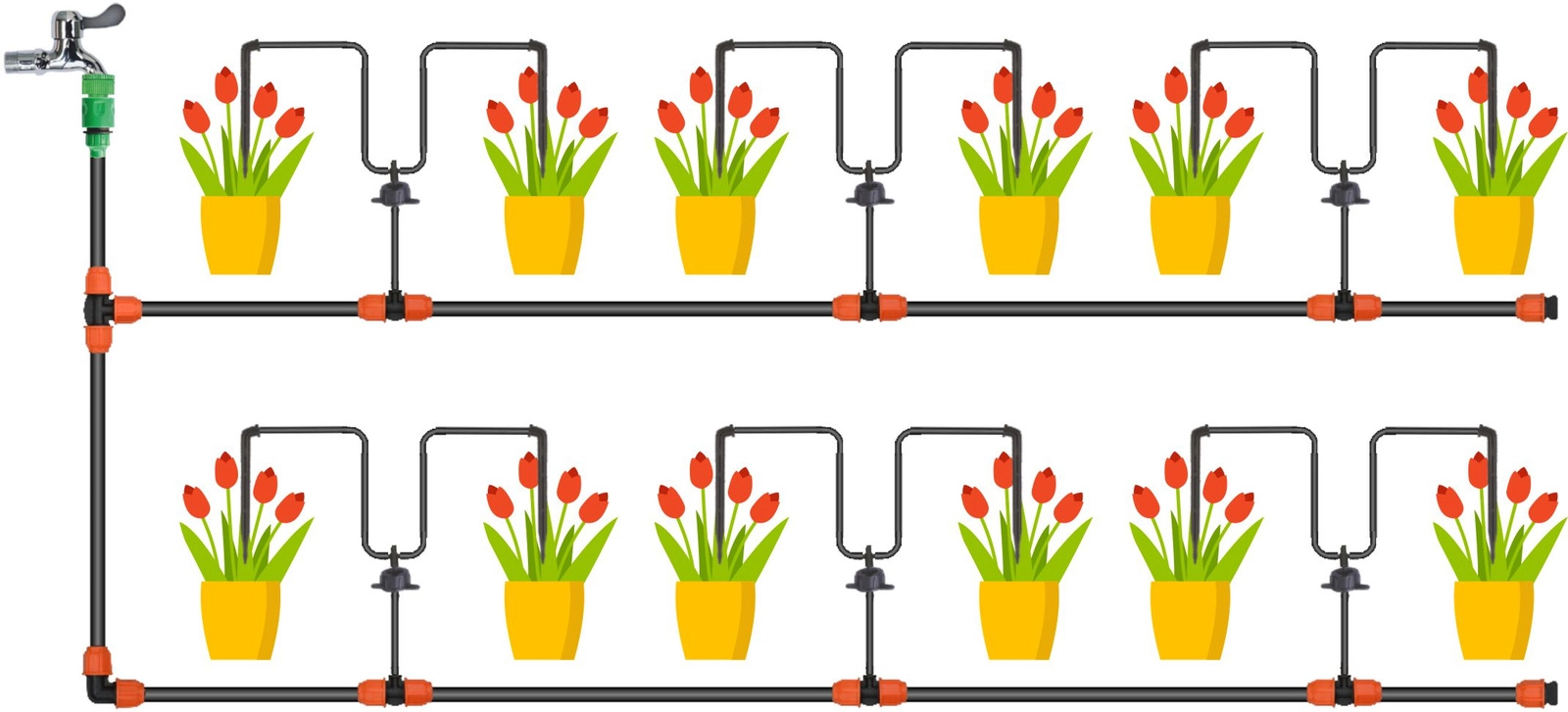 Hlavní vedení 9×12 mm a odbočky 4×7 mm usnadní přivést vodu přesně k rostlinám. Flexibilní hadice se snadno tvarují a ukládají.