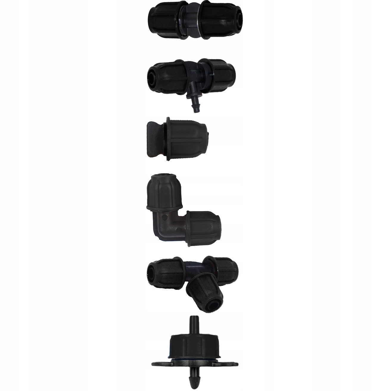 T-kusy, kolena, spojky a koncovky pro libovolné větvení. 10 kapkovačů s tyčkou pro cílené zalévání jednotlivých rostlin.