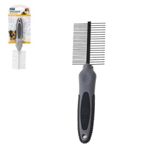 Praktický oboustranný hřeben pro psy a kočky o rozměrech 19 × 5 cm je skvělým pomocníkem pro každodenní péči o srst. Díky dvěma typům zubů zajišťuje efektivní rozčesávání, snadné odstraňování zacuchané srsti a podporuje zdravý, lesklý vzhled. Ergonomická pogumovaná rukojeť zaručuje pohodlné a bezpečné držení při česání.