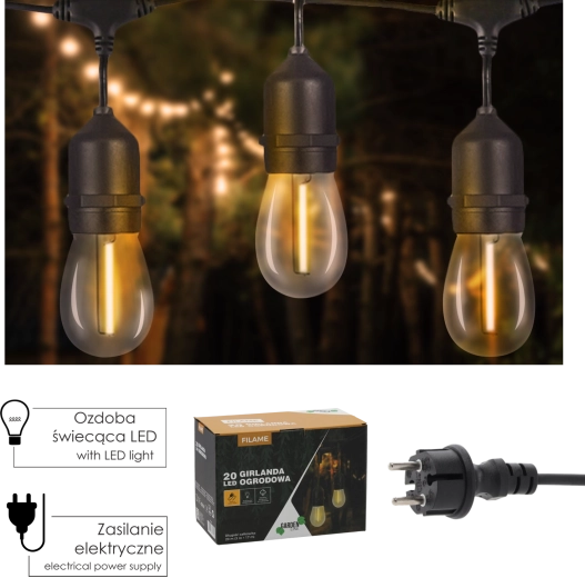 Vytvořte si kouzelnou atmosféru na zahradě, terase nebo balkonu se světelnou girlandou o délce 20 m s 20 LED žárovkami E27 v odstínu teplé bílé (3000 K). Odolnost IP44 zajišťuje použití venku, úsporné žárovky 1 W šetří energii a možnost propojování více setů pokryje i velké prostory.